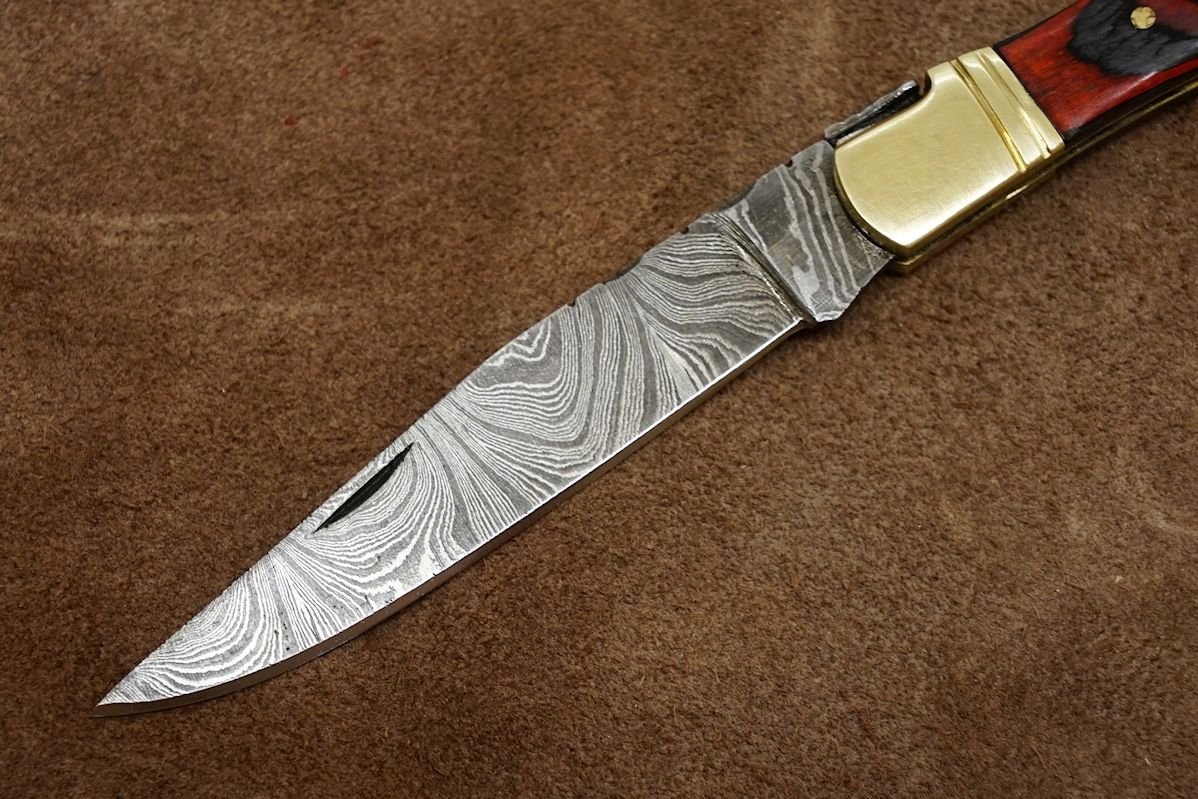 Лезвие - с профилем зажим, изготовлено из дамасской стали, ковано из 374 слоев стали 15Н20 и 1095, закаленное. до ок. 56 HRC, имеет вогнутый срез, идеален для резки, имеет декорированный корешок и пружину,