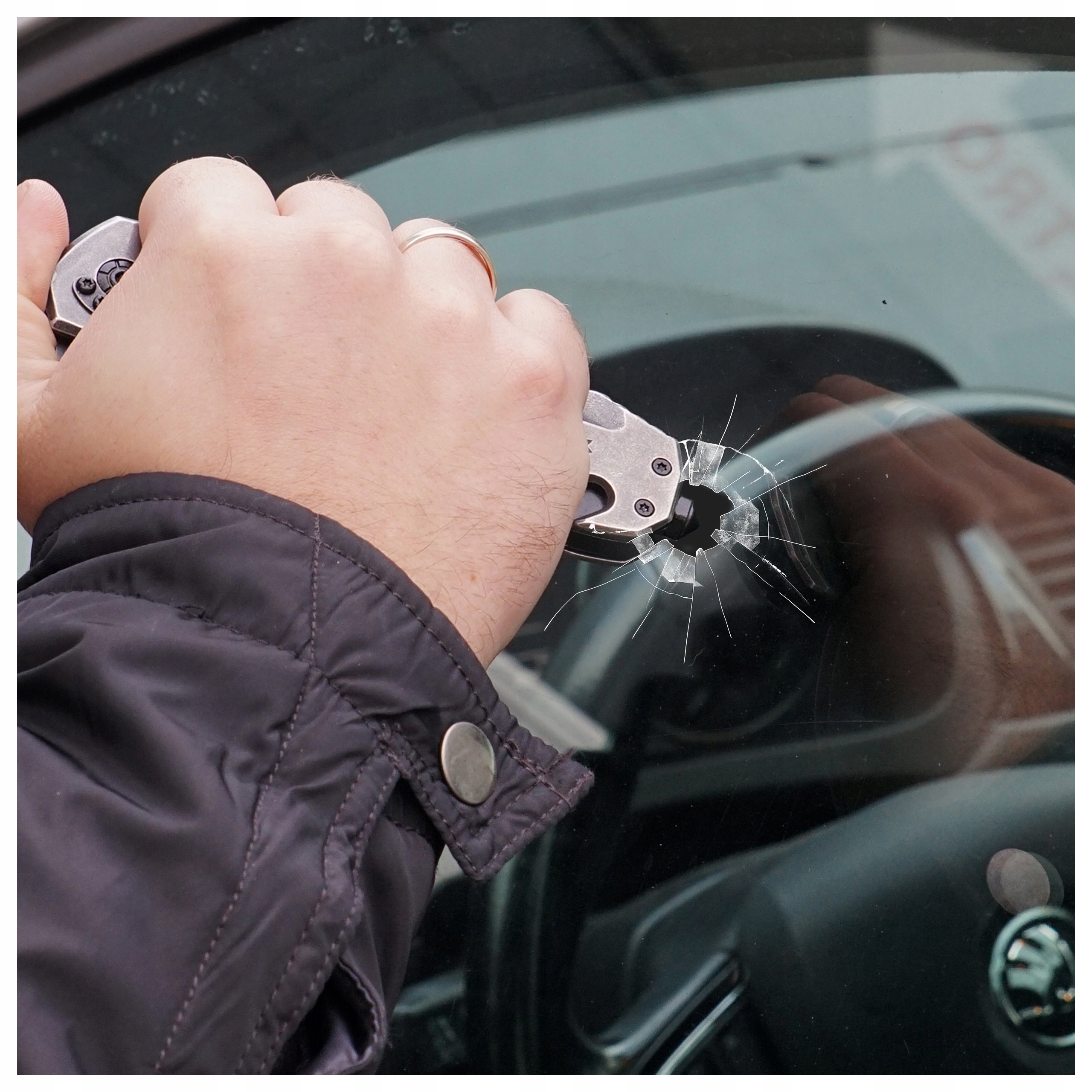 - Встроенные спасательные инструменты: стеклобой и лезвие для разрезания ремней и веревок.