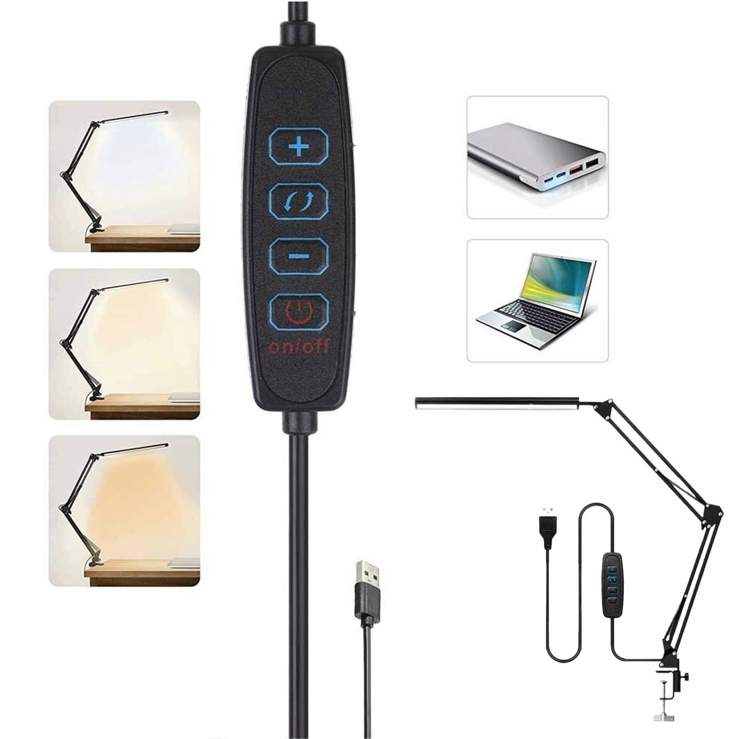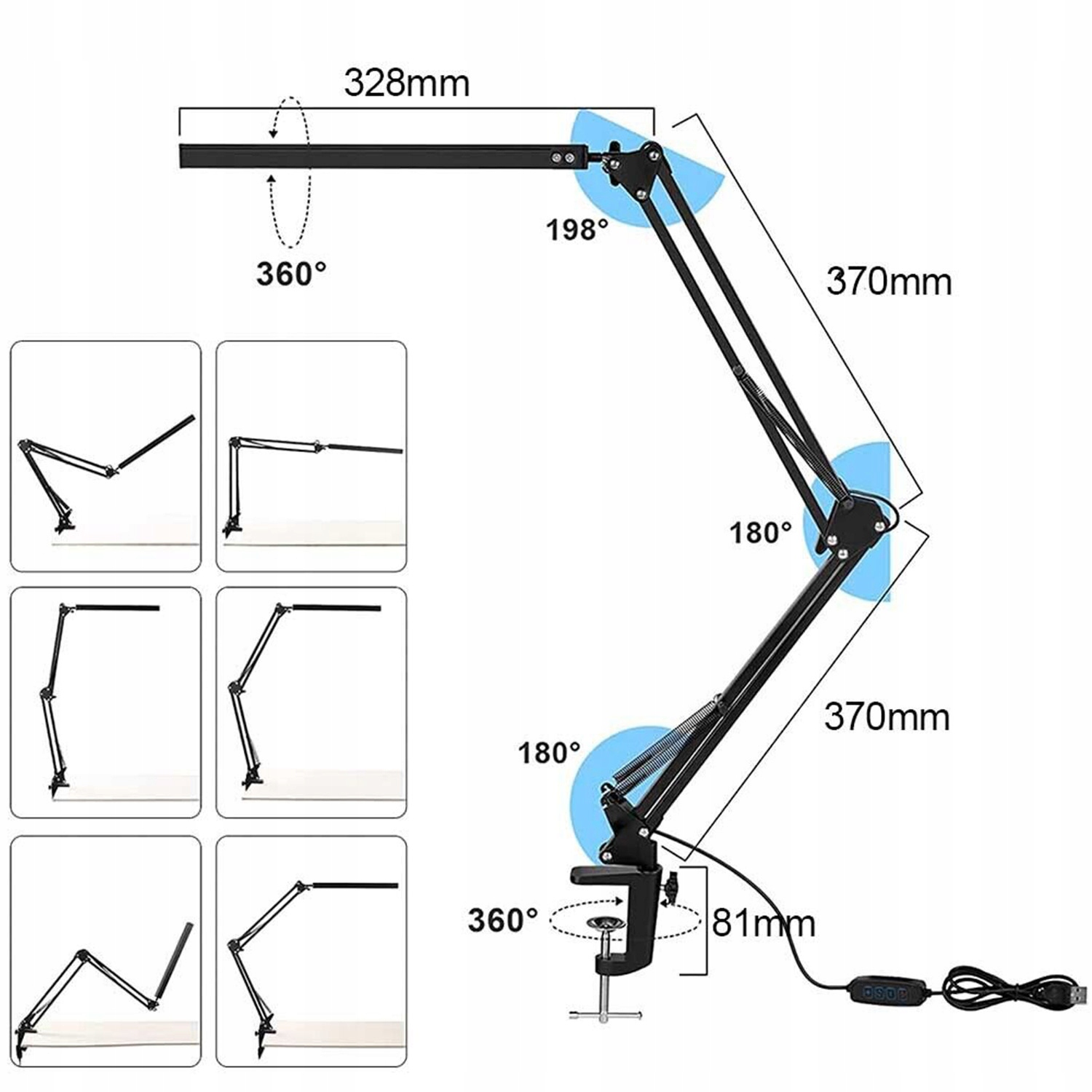 Прочный алюминиевый зажим поддерживает поверхность стола и надежно удерживает поворотный кронштейн лампы на месте. Он имеет вращающуюся на 360° головку лампы, вращающееся на 360° основание, а также регулируемые углы и несколько положений, что позволяет регулировать направление освещения в соответствии с вашими индивидуальными потребностями.