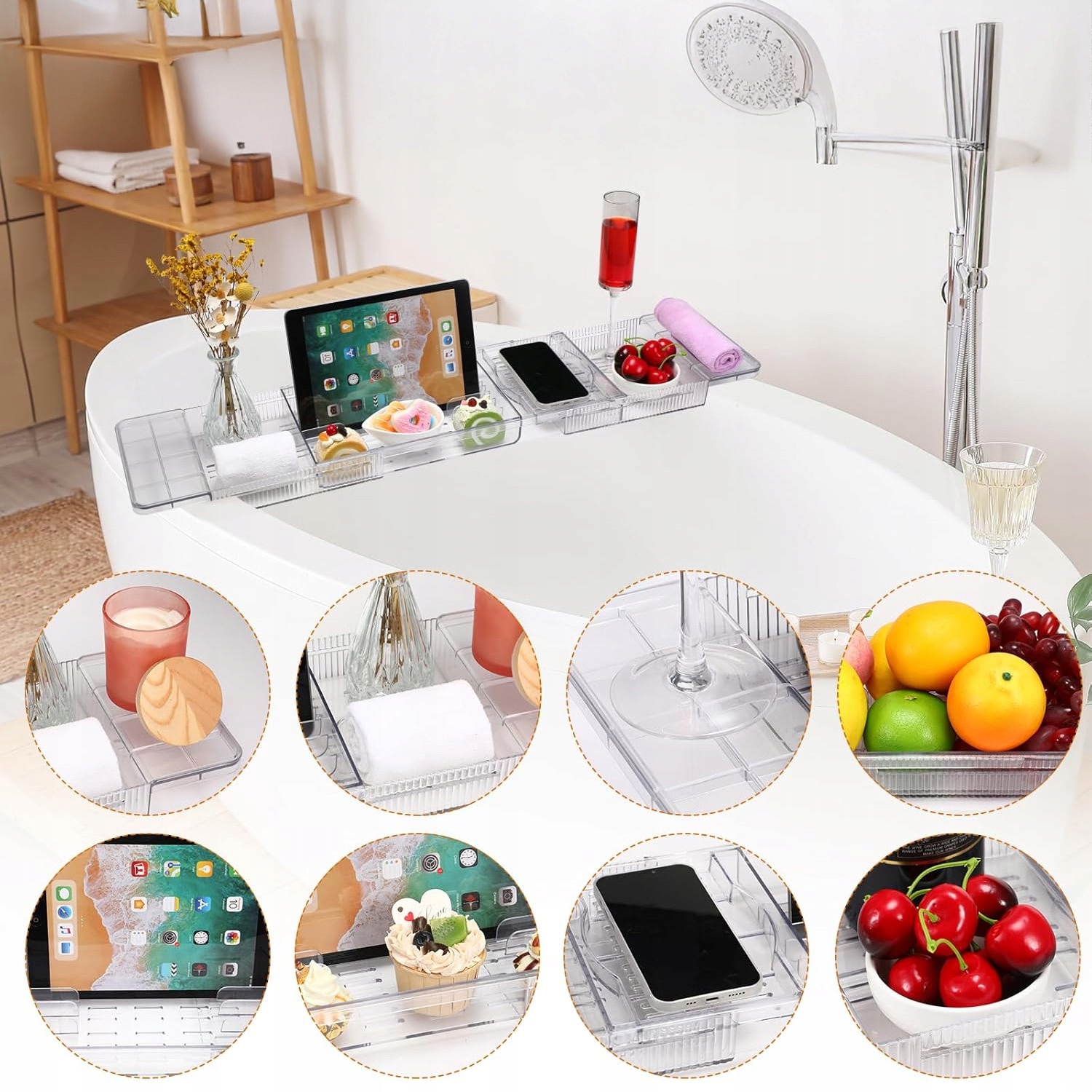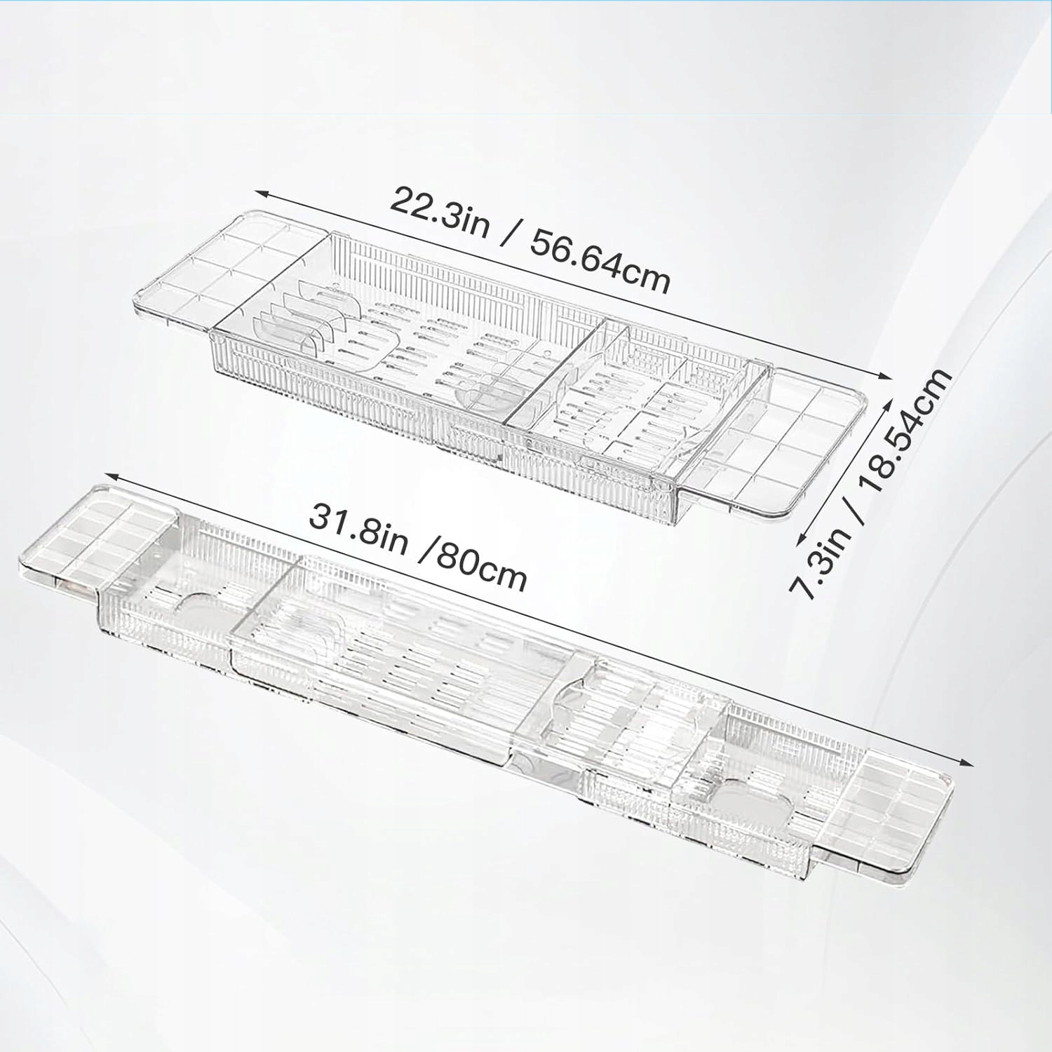 Наша расширяемая полка для ванны — незаменимая вещь для любителей отдыха! Благодаря регулируемой длине (56–80 см) он идеально вписывается в большинство ванн. После использования его можно сложить и хранить - он занимает минимум места!