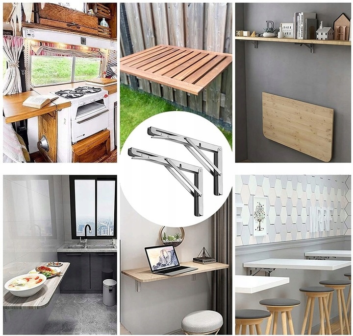 - Вы можете использовать эти кронштейны для закрепления столешниц в гаражах, прачечных, кухнях, гаражах, лодках, приемных, садах, домах на колесах, а также закрепить эти складные кронштейны на стене.