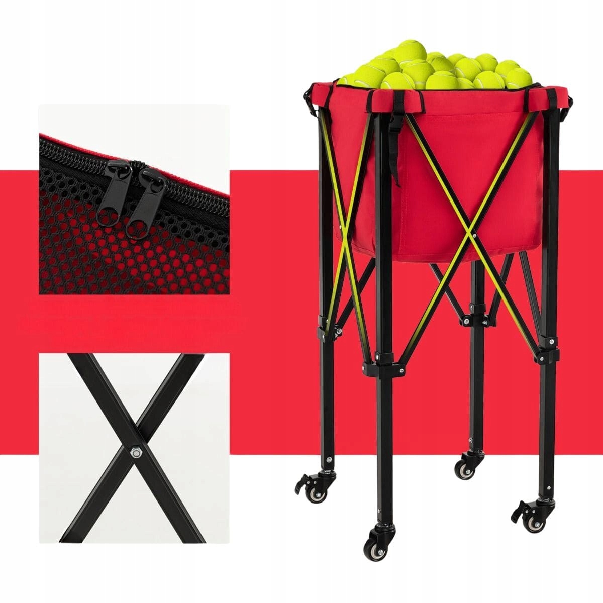 Съемная большая сумка -подключения: Этот теннисный футбольный тележка может держать до 150 теннисных мячей. Он имеет два боковых кармана для хранения телефонов и ключей. Двойные молнии облегчают открытие сетчатой корзины. Более того, прикрепление полосы с пряжками на всех четырех рогах помогают прикрепить сумку к тележке