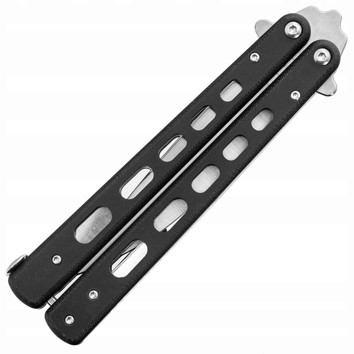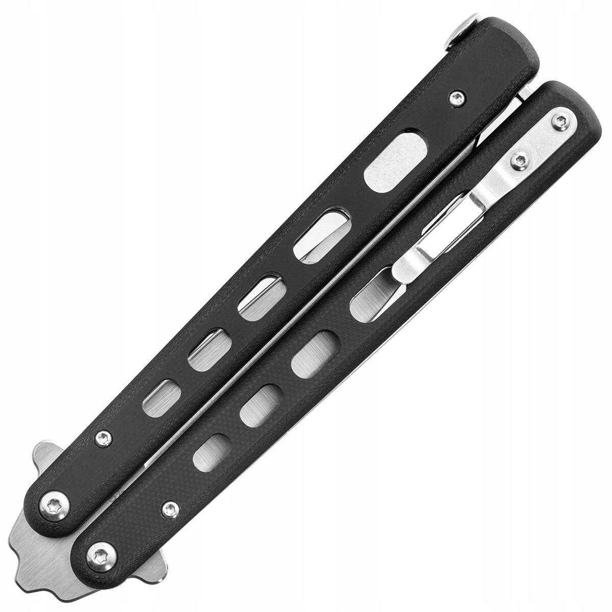 Классический нож-бабочка с клинком с профилем drop-point, изготовленным из стали 440С, обладающей повышенной механической прочностью по сравнению со сталью 440А. Он долго сохраняет остроту и легко затачивается. Он устойчив к коррозии и устойчив к механическим воздействиям. Лезвие имеет сатиновое покрытие.