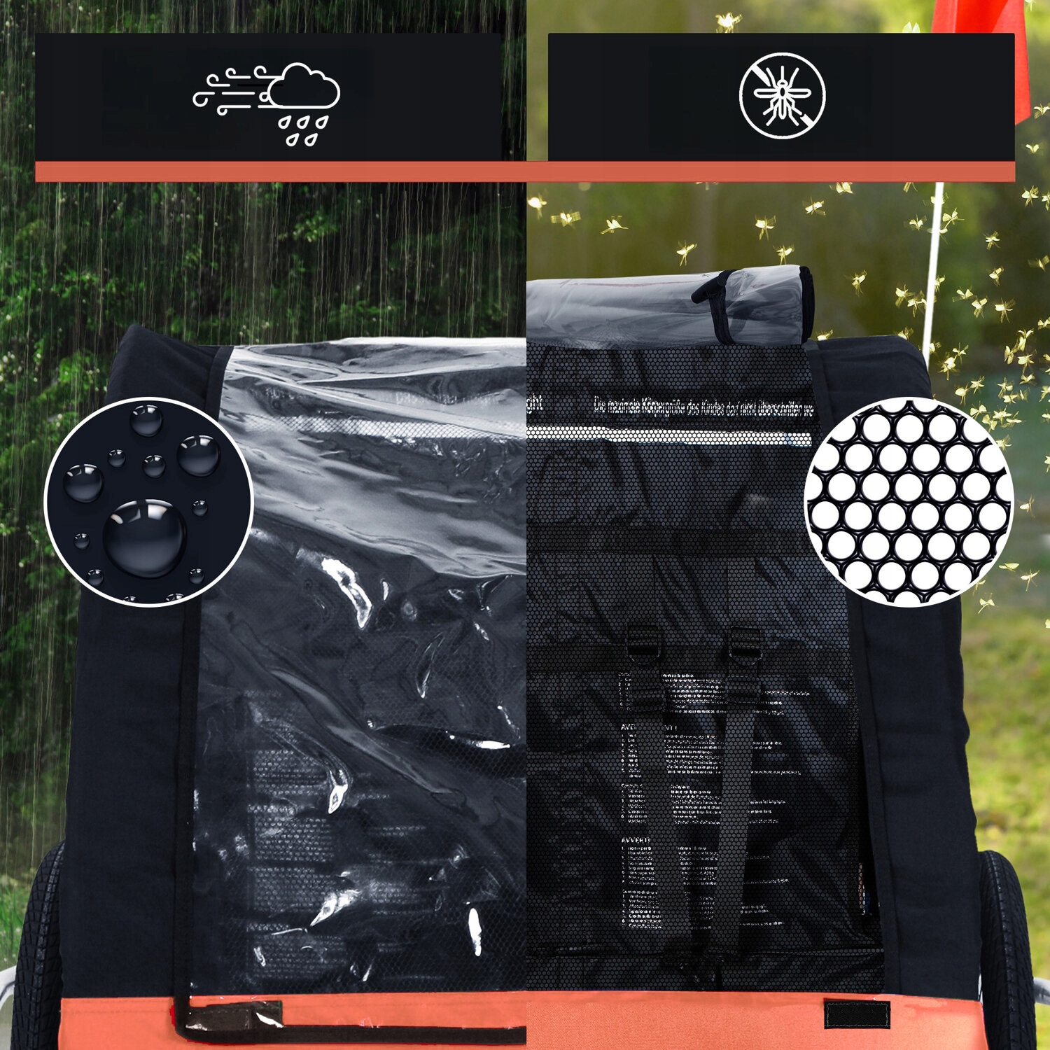 ПРОЧНОСТЬ: трубчатая стальная рама и прочная ткань Оксфорд делают детский велоприцеп устойчивым к повседневной эксплуатации, ролик из ПВХ защищает пассажиров от дождя, а москитная сетка от насекомых.