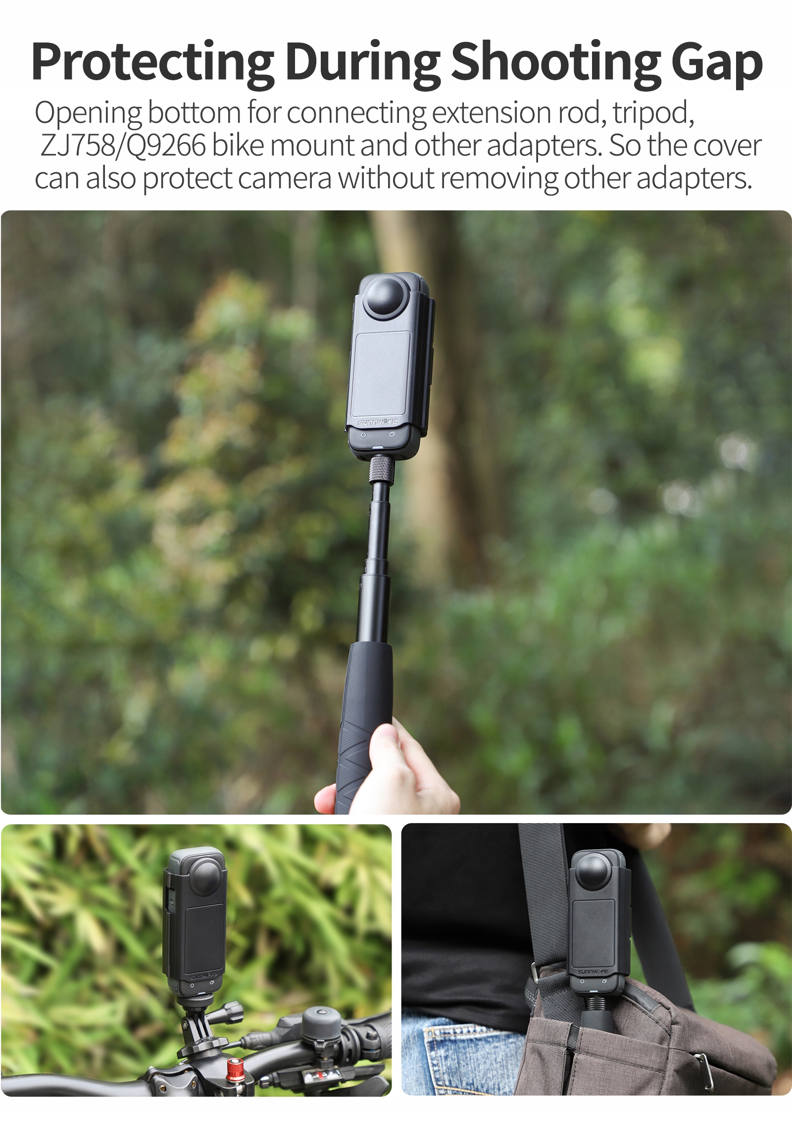 Защита всегда между съемками. Конструкция нижнего отверстия позволяет быстро подключать удлинители, штативы, крепления для велосипедов ZJ758/Q9266 и другие аксессуары, а также может защитить вашу камеру в любое время во время перерывов в съемке.