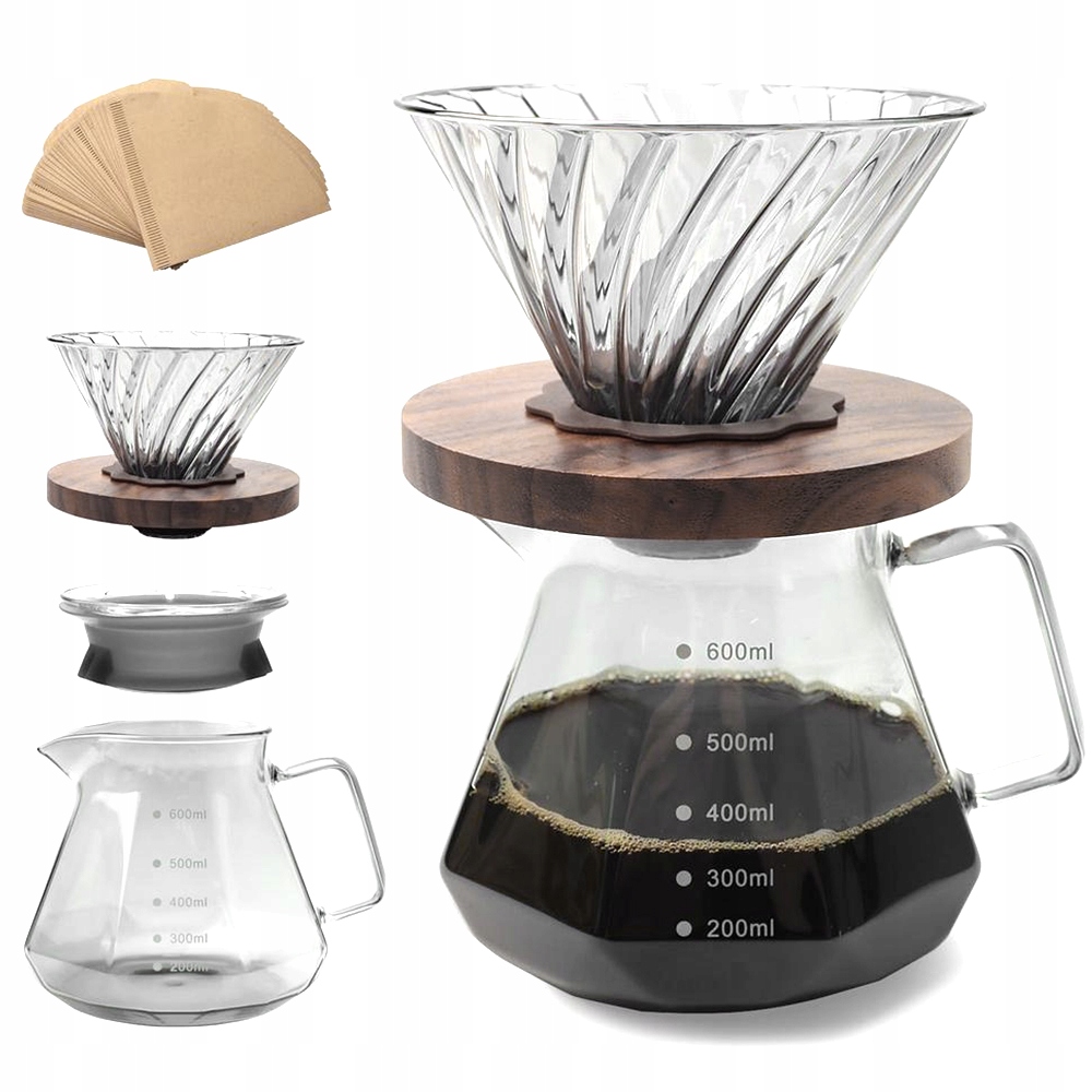 Набор кофейников для перелива, 600 мл, боросиликатное стекло, 2 бумажных фильтра, 100 листьев, ручки из ореха, для дома, кафе, ресторана и кемпинга, 20 унций, от 1 до 3 чашек