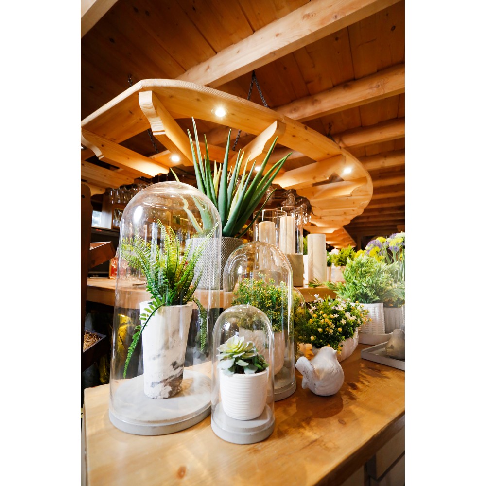 Бетонное основание плюс стеклянный абажур имеет множество применений. Он послужит красивым декоративным элементом. Идеально подходит для демонстрации искусственных растений или различных украшений.