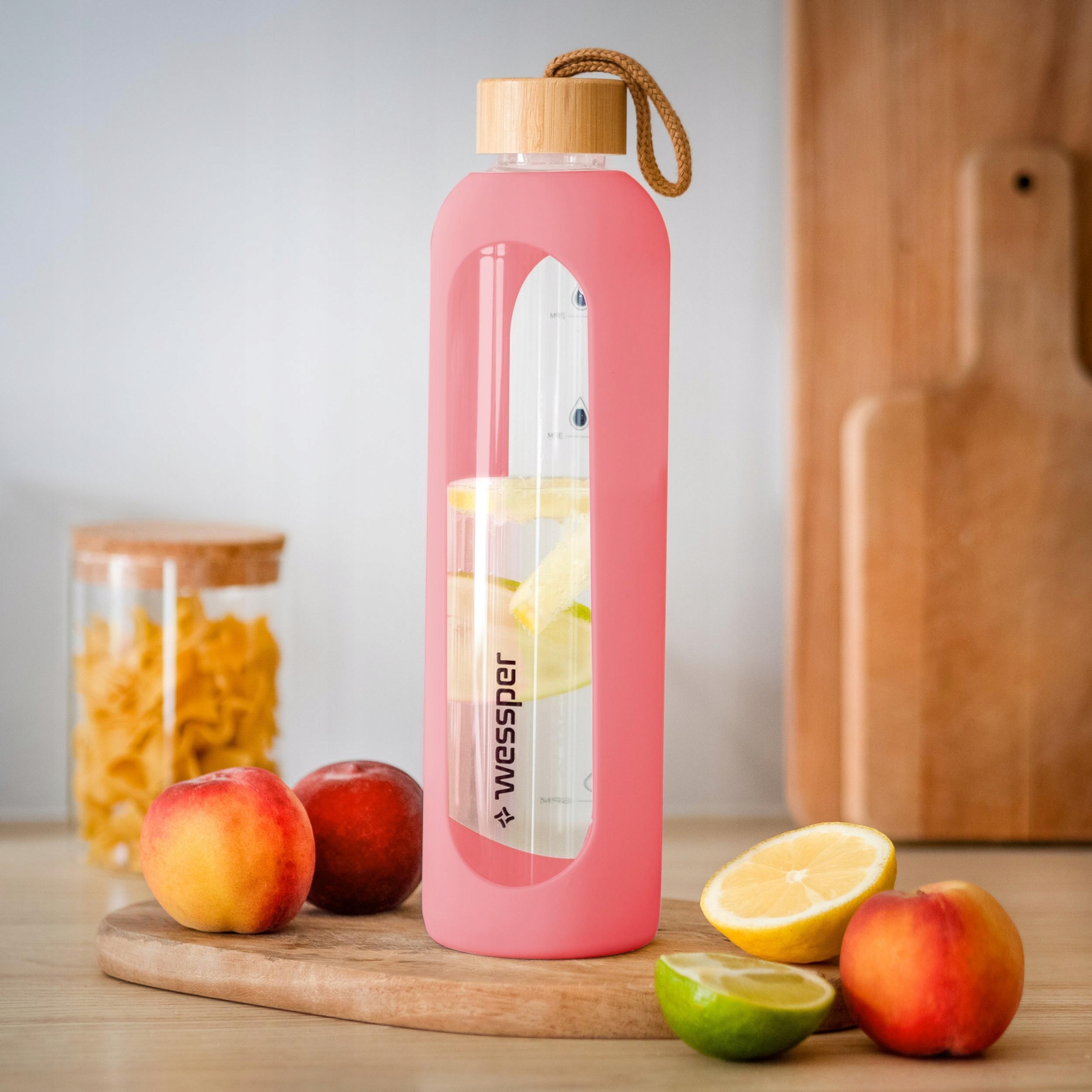 БУТЫЛКА WESSPER ACTIVEMAX КРИСТАЛЛИЧЕСКОЕ СТЕКЛО С СИЛИКОНОВЫМ КОРПУСОМ 1л - РОЗОВЫЙ ЦВЕТ