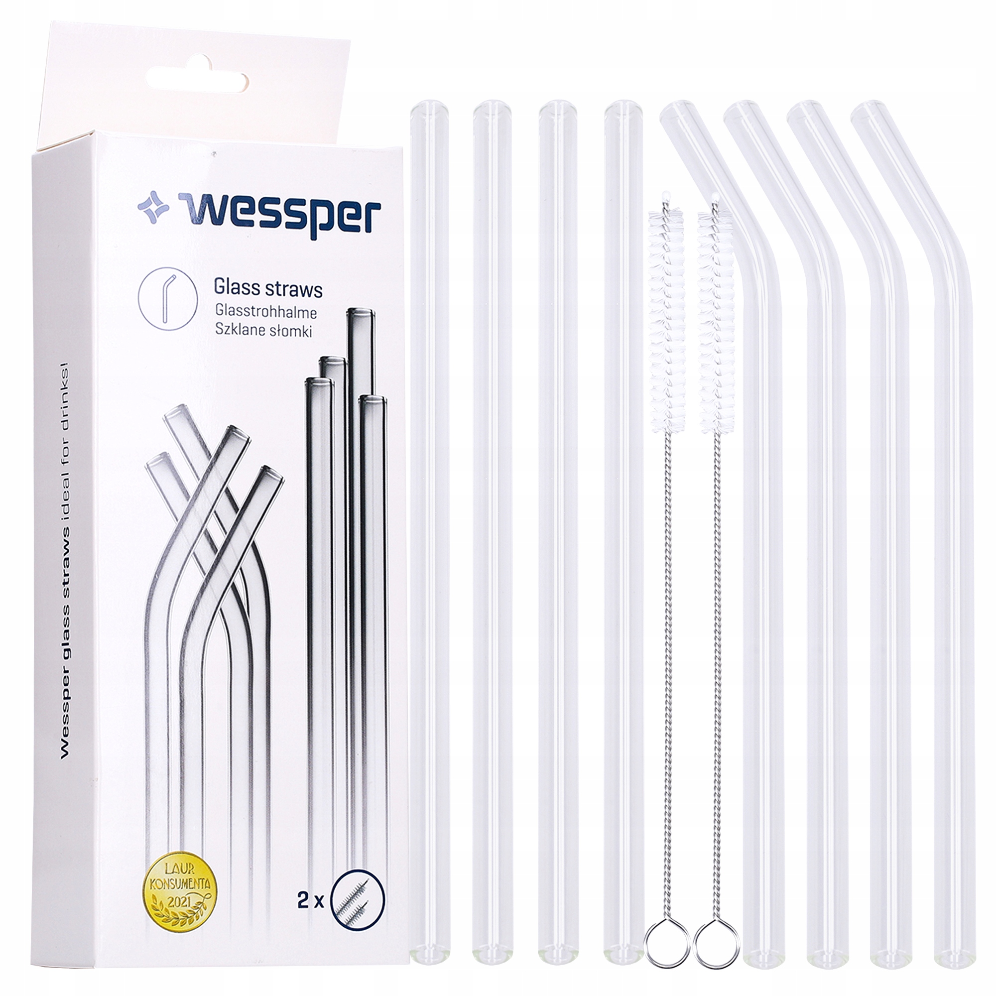 СОЛОМИНКИ WESSPER, МНОГОРАЗОВЫЕ СТЕКЛЯННЫЕ ТРУБКИ 8 шт. + 2 шт. ОЧИСТИТЕЛЬ