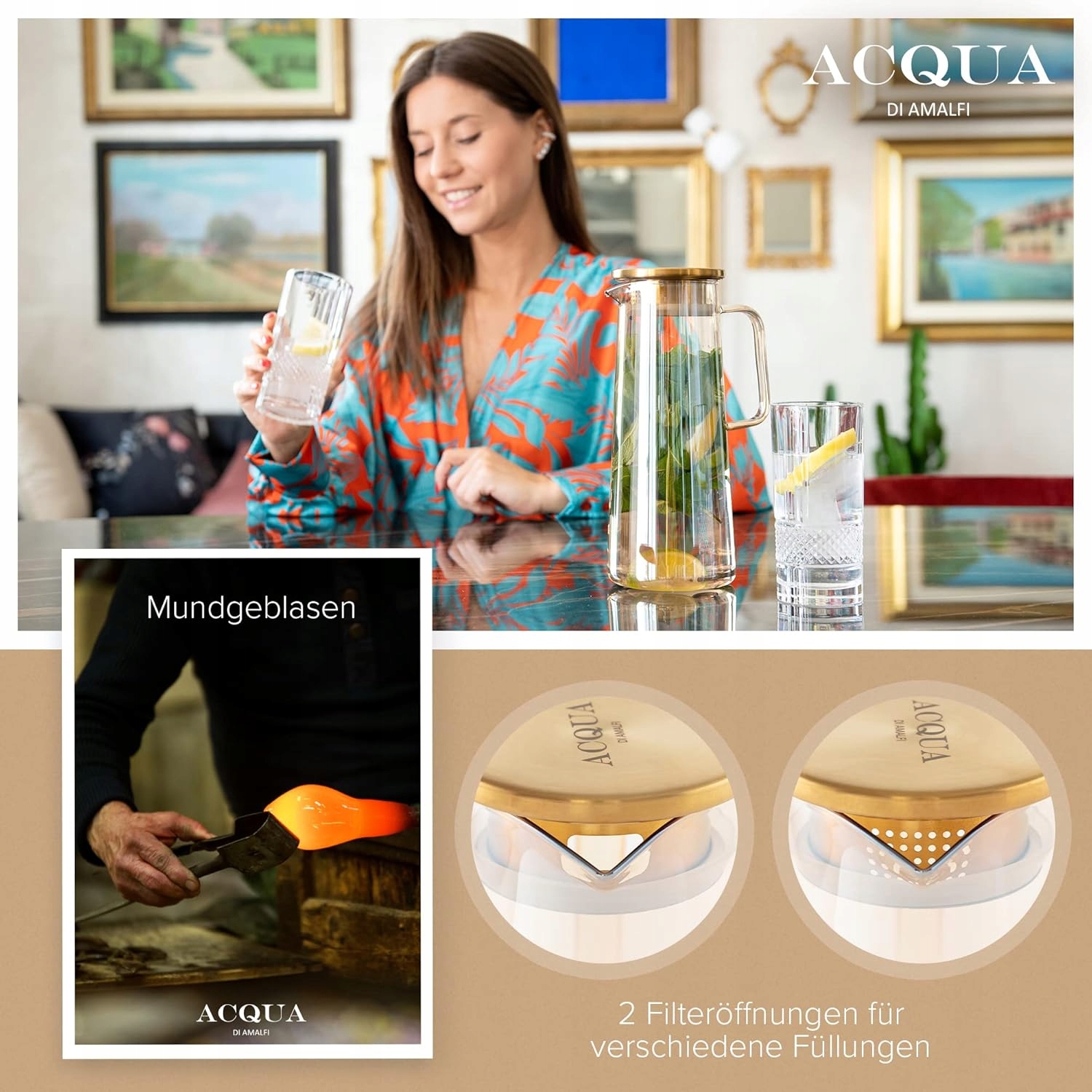 - Элегантный стеклянный графин с крышкой: надувной караф для воды для водного обеспечения Di Amalfi передает образ жизни побережья Амальфи к вашему дому. Идеально подходит для подачи воды, чая или других напитков в стиле