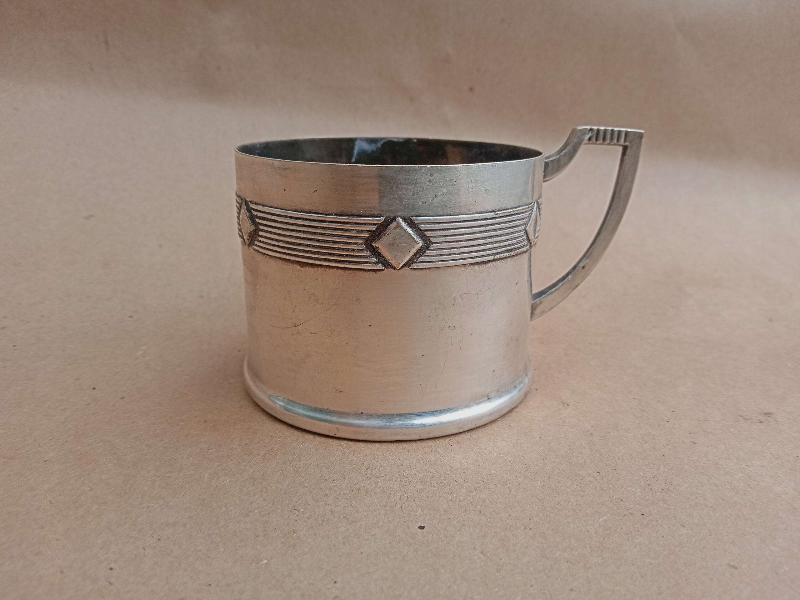 Посеребренная, небольшая потертость серебрения рядом с квадратным декором - фото № 8, высота с ручкой ок. 6 см, диаметр края ок. 6,5 см