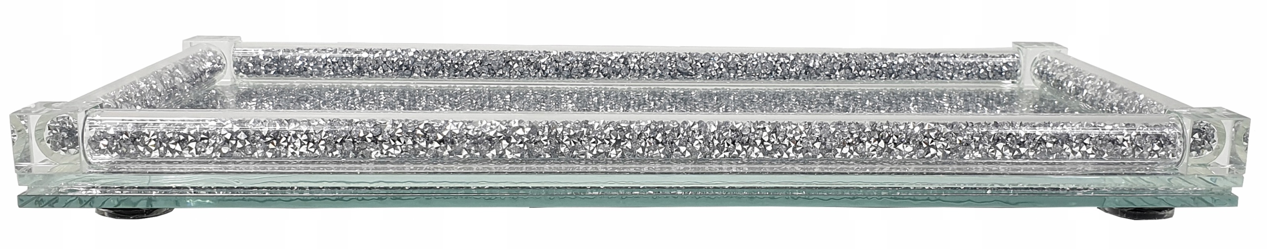 Поднос стеклянный, наполненный мелкими сверкающими кристаллами, простая форма которых придаст очарования любому интерьеру.