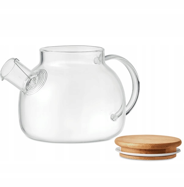 Чайник из боросиликатного стекла с заварочным элементом из нержавеющей стали и бамбуковой крышкой.