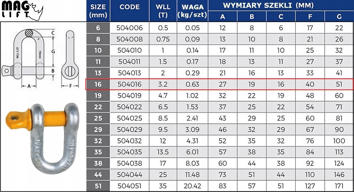 пример: дужка согласно DIN 82101, диаметр штифта 22 м, максимальная прочность 2 т, высокопрочная дужка согласно PN-EN13889 > при диаметре пальца 22 мм грузоподъемность 4,75 т.