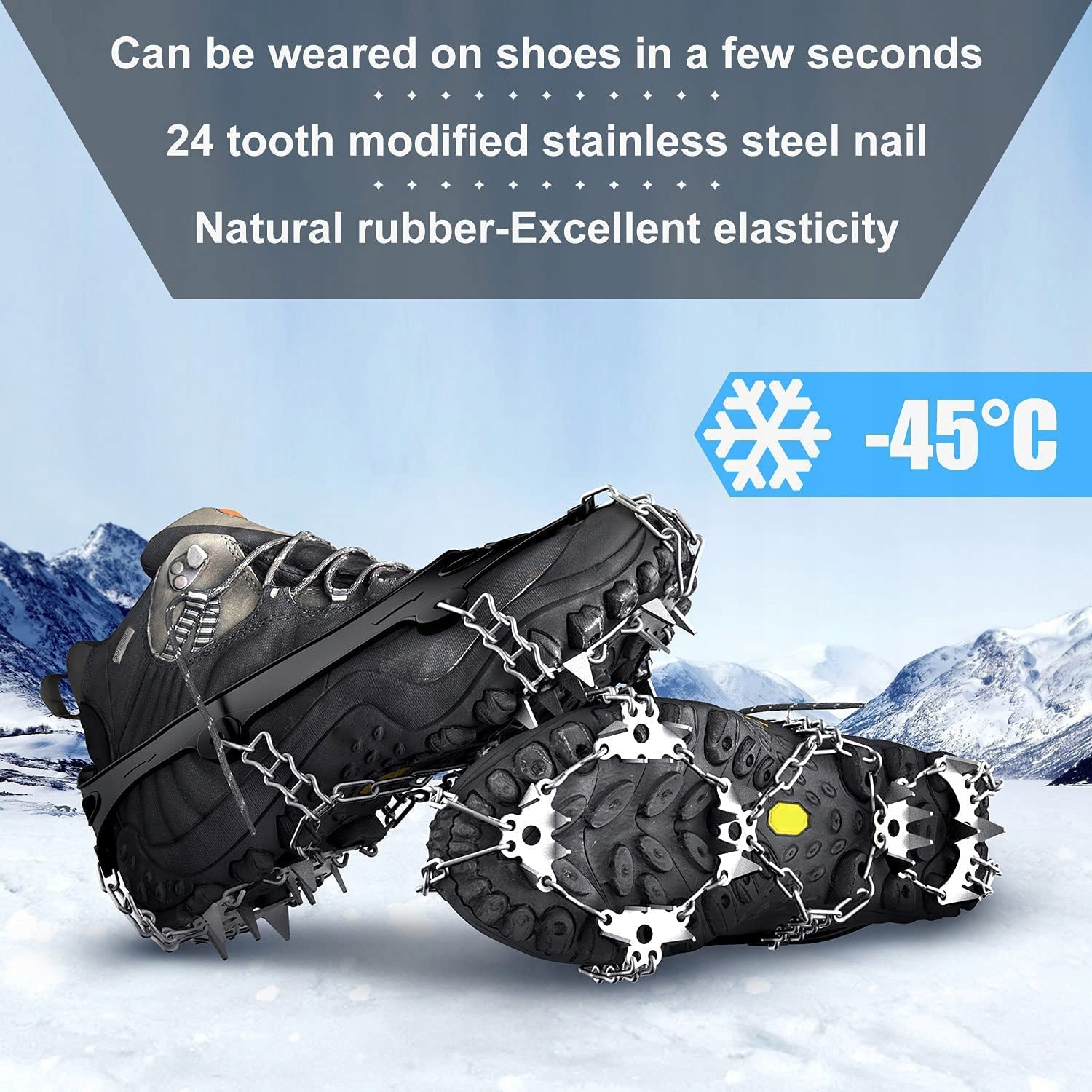 ✅ Усиленные кошки из нержавеющей стали с 24 зубьями и двойной цепной системой можно надежно прикрепить ко всем ботинкам. Эти цепи противоскольжения не ржавеют и подходят для езды по льду, снегу и скользкой дороге.