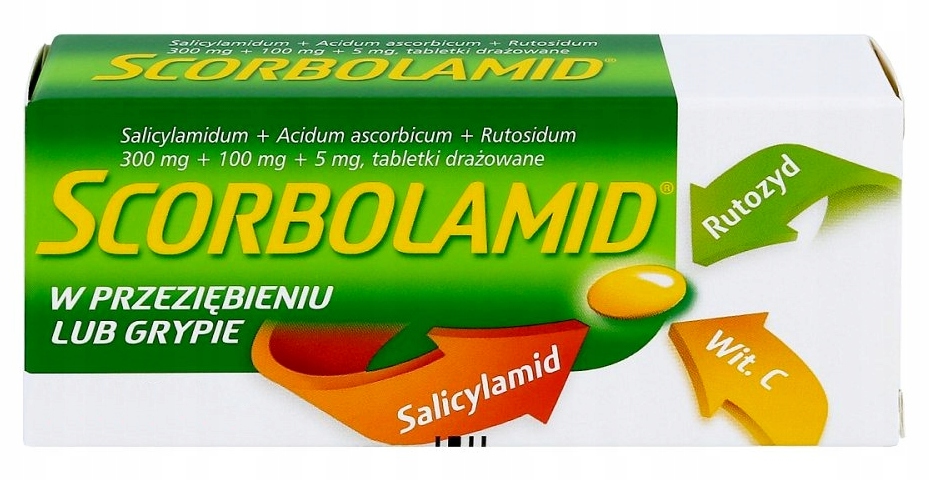 Скорболамид 300 мг + 100 мг + 5 мг – препарат в форме таблеток, покрытых сахарной оболочкой, применяемый при лихорадке и болях, связанных с простудой или гриппом, а также при головных болях и невралгиях. Он содержит салициламид, который обладает жаропонижающим, обезболивающим и противовоспалительным действием и рутозид, который укрепляет сосуды и повышает их эластичность, а также защищает витамин С от окисления, благодаря чему витамин С действует дольше. Аскорбиновая кислота (витамин С), присутствующая в препарате, восполняет дефицит витамина С, поддерживая иммунитет организма при инфекциях.