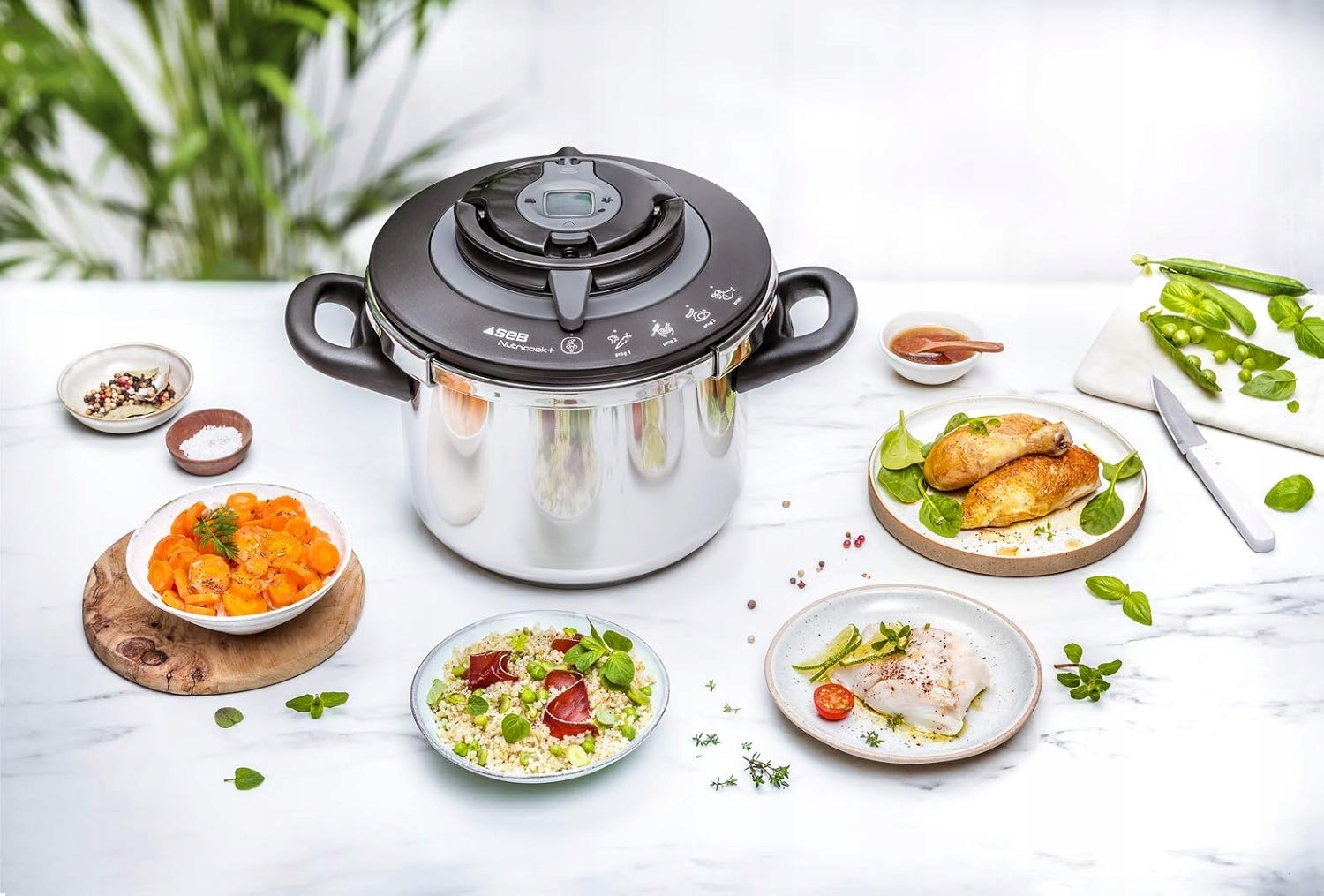 Скороварка SEB® Nutricook®+ выходит за рамки традиционной скороварки и сочетает в себе 4 различные программы, позволяющие готовить любые блюда при идеальной температуре, а также финальный этап мягкого приготовления, обеспечивающий вкус блюд. Овощи, крупы/бобовые, мясо и рыба сохраняют превосходную консистенцию, натуральный вкус и пищевую ценность. Благодаря большой вместимости (до 8 человек) Nutricook®+, практичным функциям, упрощающим приготовление пищи, обеспечивающим вкусные результаты и полезным аксессуарам, достигается высочайший уровень приготовления на пару.
