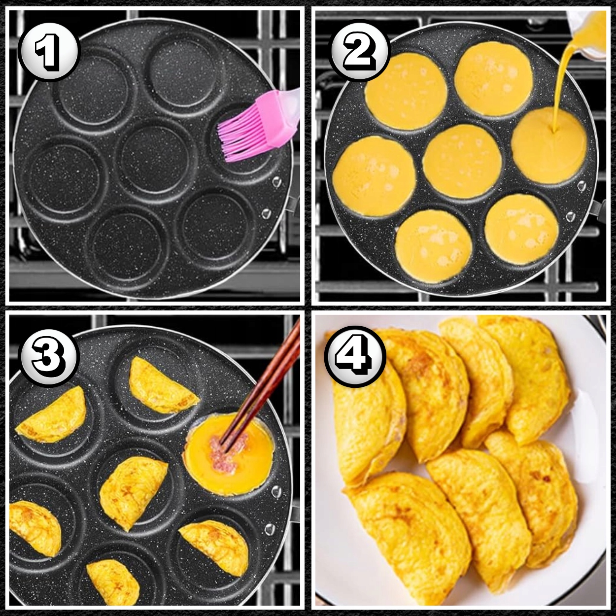 - 7 ШТУК НА 7 БЛИНЧИКОВ/ЯИЦ – используется для приготовления 7 яичниц или 7 блинов за раз. Позволяет быстро и диетически жарить.