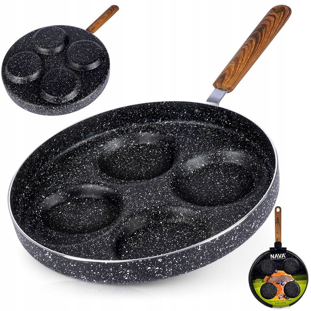 ✅ НАДЕЖНОСТЬ - Сковорода с гранитным покрытием, диаметром 26 см, с четырьмя отверстиями, предназначена для приготовления яичницы и блинов. Внешние размеры: длина 44 см, высота кастрюли 5 см, высота с ручкой 7 см. Разделен на четыре отверстия диаметром 9 см. Изготовлен из литого алюминия. Сковорода черная. Имеет ручку из материала, имитирующего дерево.