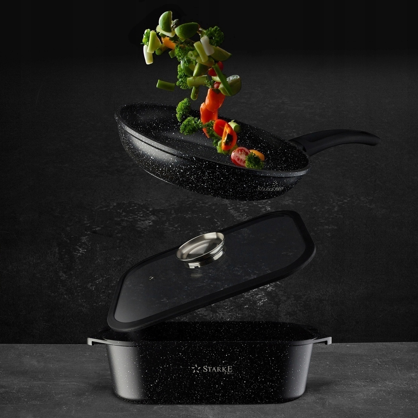 Индукционная сковорода-гриль Starke Pro Chelsea диаметром 28 см из мрамора и гранита изготовлена из алюминия. Для его создания использовалась технология гомогенного литья под давлением. Благодаря этому он идеально сбалансирован и очень прочен с точки зрения механических и термических свойств. Антипригарное покрытие также обеспечивает повышенную долговечность. Внутренняя часть сковороды отделана мраморным покрытием GREBLON C3, обогащенным гранитными частицами. Его высокое качество, отличная адгезия, твердость и трехслойная структура разработаны немецкой компанией WEILBURGER. Он также имеет маркировку PFOA Free. Энергоэффективность обеспечивается индукционным дном толщиной 3,8 мм. Благодаря этому вы можете использовать мраморную сковороду-гриль Chelsea диаметром 28 см на любой плите. Антипригарное покрытие также позволяет жарить с небольшим количеством жира и упрощает уход. Она выдерживает до 8000 циклов истирания, что в четыре раза больше, чем у обычных сковородок с антипригарным покрытием, доступных на рынке. Переносить и использовать модель облегчает ручка Soft Touch, которая не нагревается и не выскальзывает из руки. Специальное тиснение дна позволит добиться эффекта жарки ингредиентов. Два носика помогут избавиться от лишнего вытопленного жира. С его помощью вы создадите свой собственный набор кухонной посуды серии «Челси». Он идеально подходит для домашнего использования. В комплект также входит фетровая подушечка, на которую можно безопасно поставить горячую сковороду, например, на столешницу или стол. Более того, вы можете использовать этот элемент в качестве прокладки между хранимыми кастрюлями.