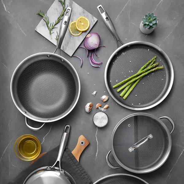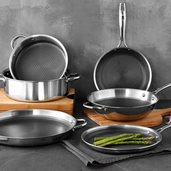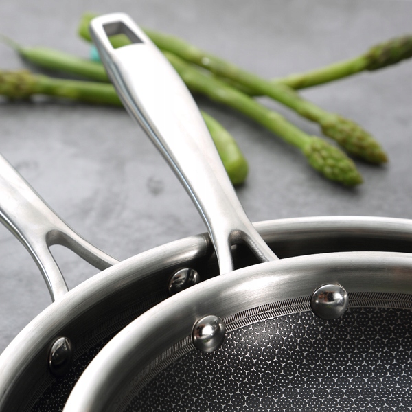 Трехслойная структура дна обеспечивает исключительную устойчивость к механическим повреждениям, предотвращает пригорание и прилипание продуктов к покрытию.