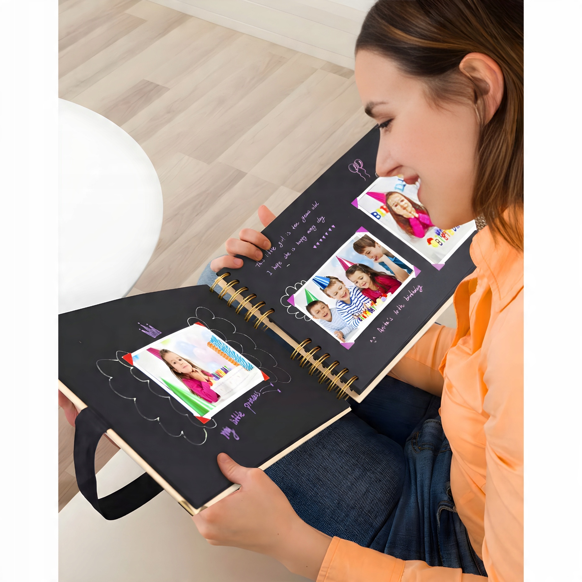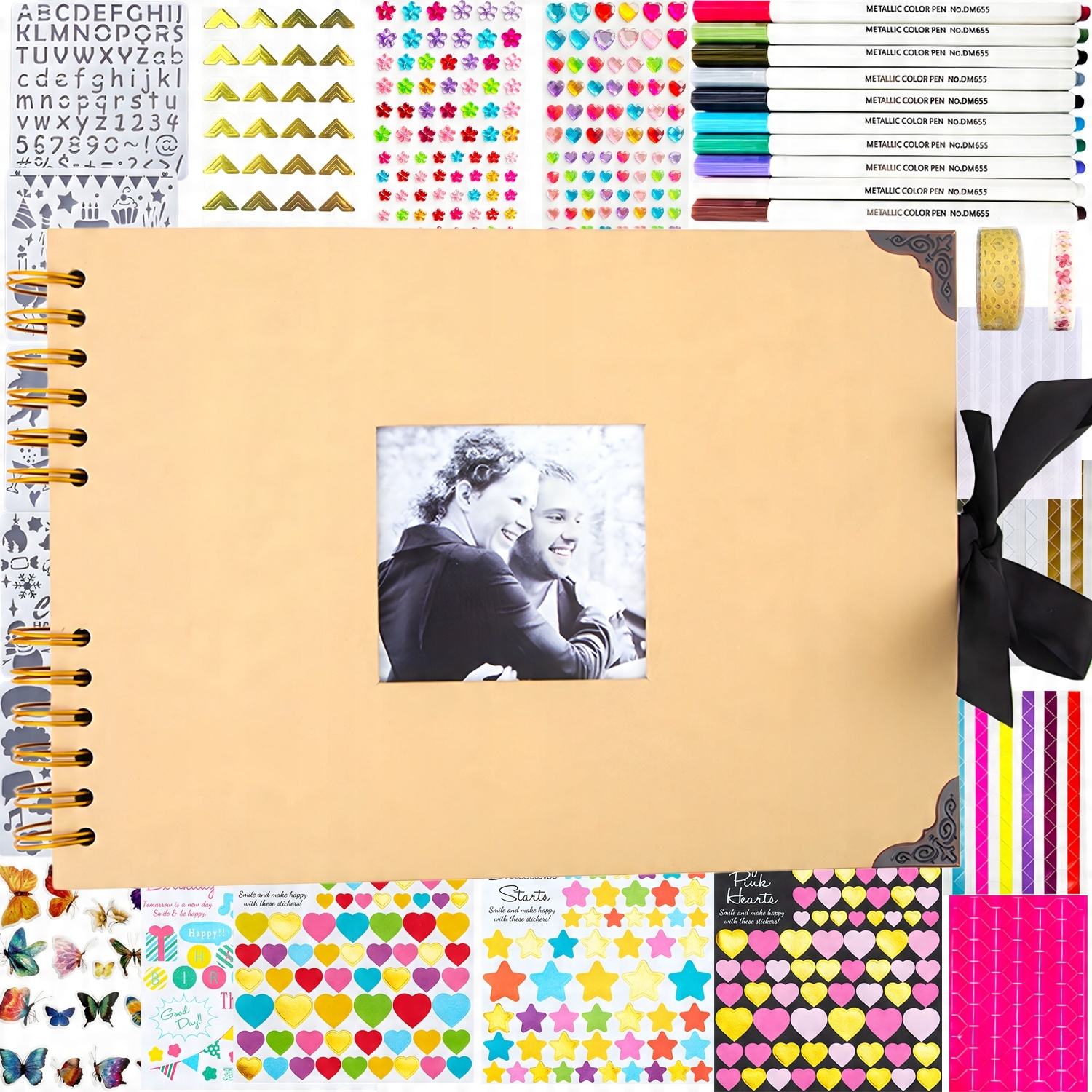 Представляем уникальный набор для создания собственного, неповторимого альбома - идеального для фотографий, воспоминаний , творческие проекты и скрапбукинг. Альбом со сплошной черной обложкой с металлическими уголками и местом для фото посередине, декоративной лентой и возможностью персонализации каждой страницы. Благодаря богатому набору аксессуаров: наклейкам, декоративным лентам, металлическим маркерам и шаблонам с различными мотивами, он идеально подходит для любителей художественных проектов и людей, которые хотят стильно и декоративно хранить воспоминания.
