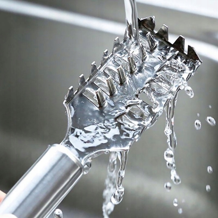 - Высокое качество - рабочая часть имеет форму зубчатой щетки, которая снимает чешую с кожи рыбы. Этот элемент изготовлен из твердого, прочного металла, эффективно защищен от влаги и легко чистится.