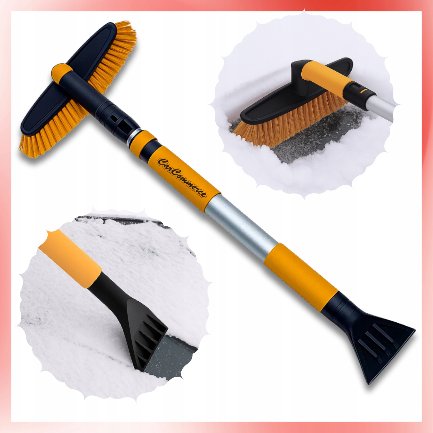 С одной стороны расположен эффективный скребок для льда, помогающий разбивать и собирать намерзший слой со стекол, с другой — щетка для быстрого удаления снега с крыши, капота и люка. Такая компоновка сокращает последовательность утренних работ: сначала вы соскребаете твердый лед в ответственных точках, затем одним инструментом «сбиваете» пух с больших поверхностей, заканчивая аккуратной чисткой зеркал и фар. Поворотная головка повышает гибкость, а телескоп позволяет поддерживать правильный угол без гимнастики. Интенсивный оранжевый цвет облегчает поиск инструмента в багажнике и на крытой подъездной дороге, а также улучшает видимость в условиях тумана или при слабом освещении. Это практичная, экономящая время комбинация, которая уменьшает количество аксессуаров в вашем автомобиле и упрощает зимние будни - независимо от того, готовите ли вы городской автомобиль для работы или семейный внедорожник для утренней поездки.