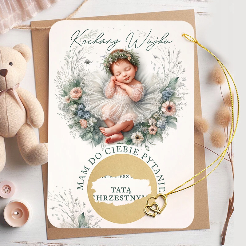 Это элегантный способ пригласить близкого человека стать крестным отцом, идеально подходящий для семейных торжеств или в рамках более крупного сюрприза. Скретч-карта также послужит прекрасным сувениром на долгие годы.