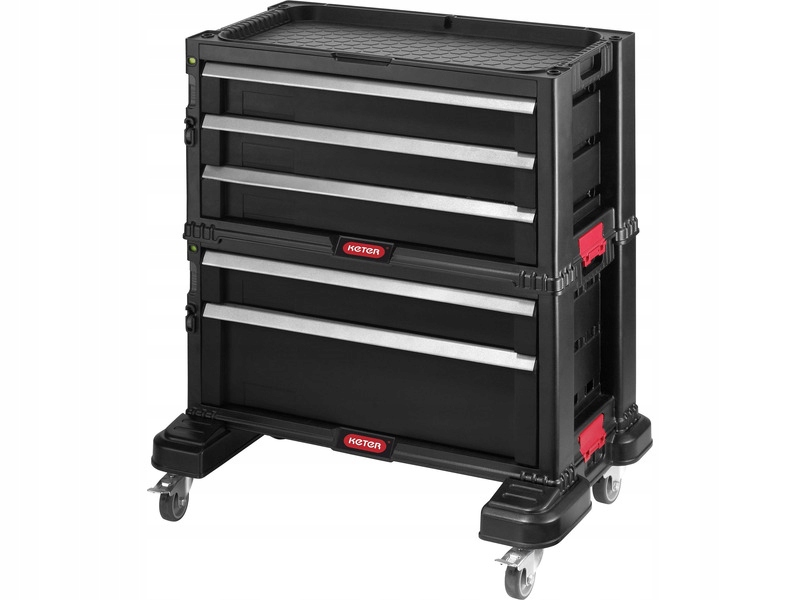 Вместительная и удобная в использовании полка – основа функционирования каждой мастерской. Универсальная конструкция с 5 ящиками включает глубокий ящик со съемными отделениями для более крупных и тяжелых инструментов и 4 ящика для мелких предметов и дополнительных аксессуаров. Удобные отделения позволяют практично хранить инструменты. Полка оснащена 16 съемными контейнерами, позволяющими хранить расходные принадлежности, например, дрели или крепеж. Изготовлен из прочного полипропиленового пластика и оснащен колесами, обеспечивающими динамическую адаптацию к текущим условиям работы.