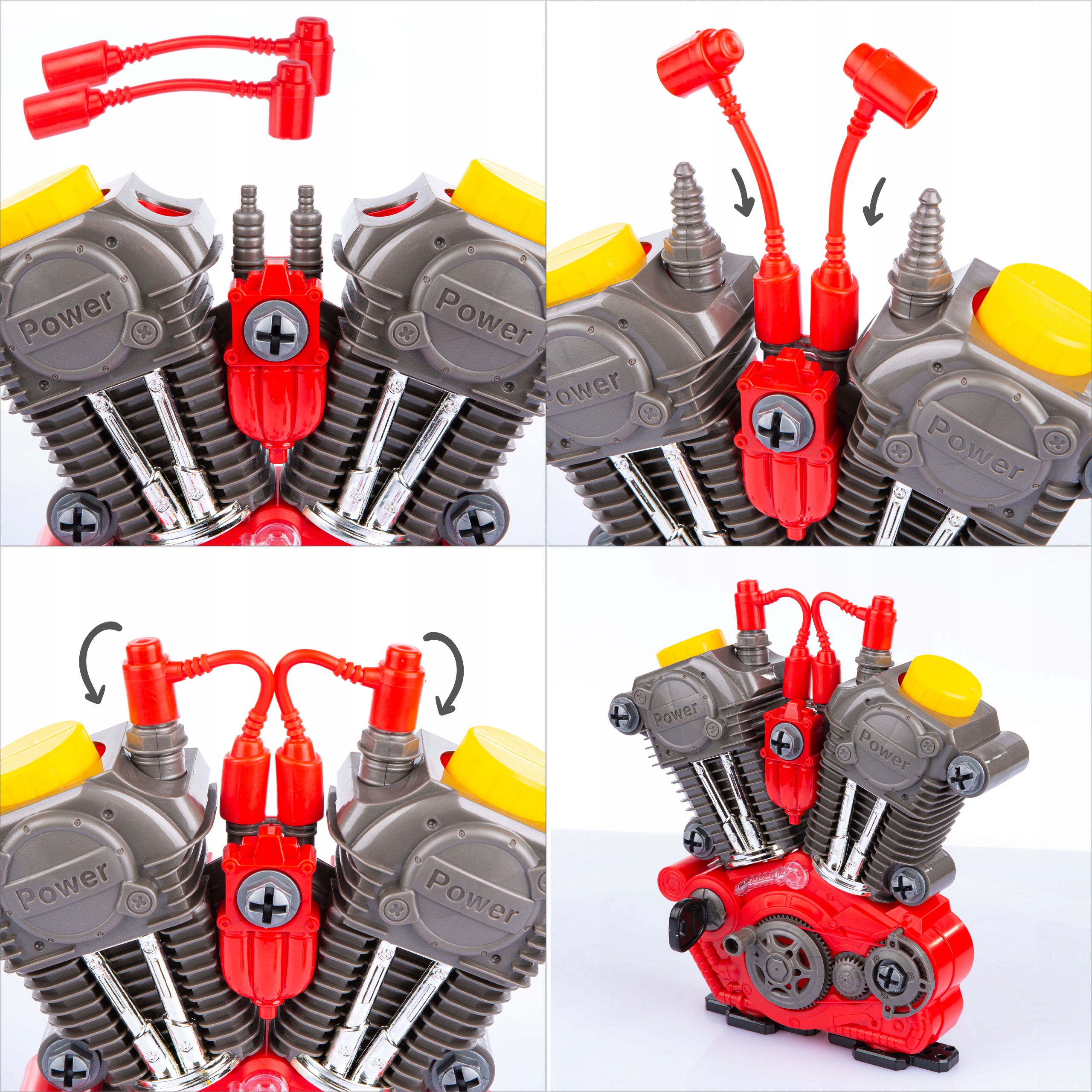 Двигатель состоит из многих элементов и учит наших детей корректировать, и реальное функционирование двигателя, как он есть на самом деле. Поршни вращаются при повороте рукоятки. Двигатель скручен и откручен, где наш маленький механик должен с ним иметь дело.