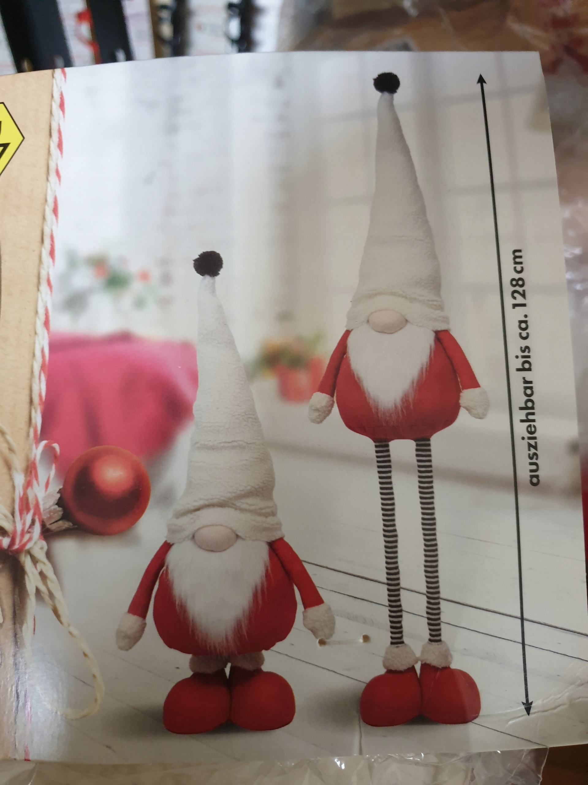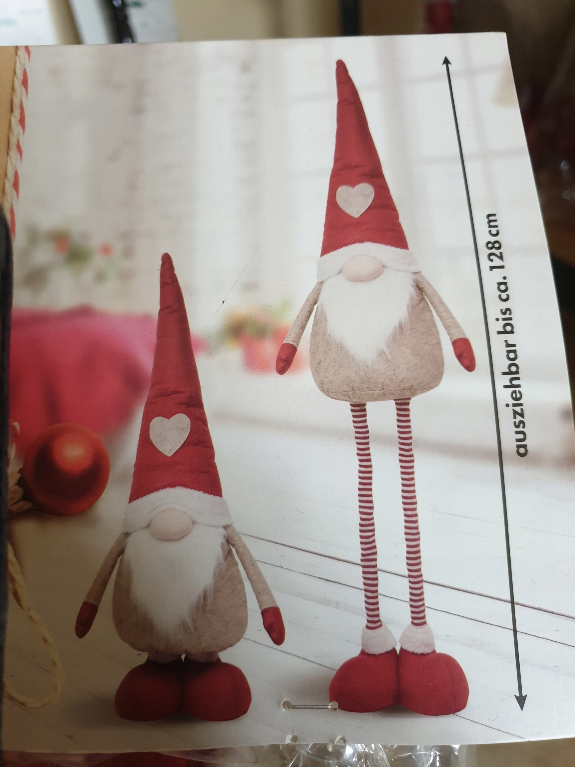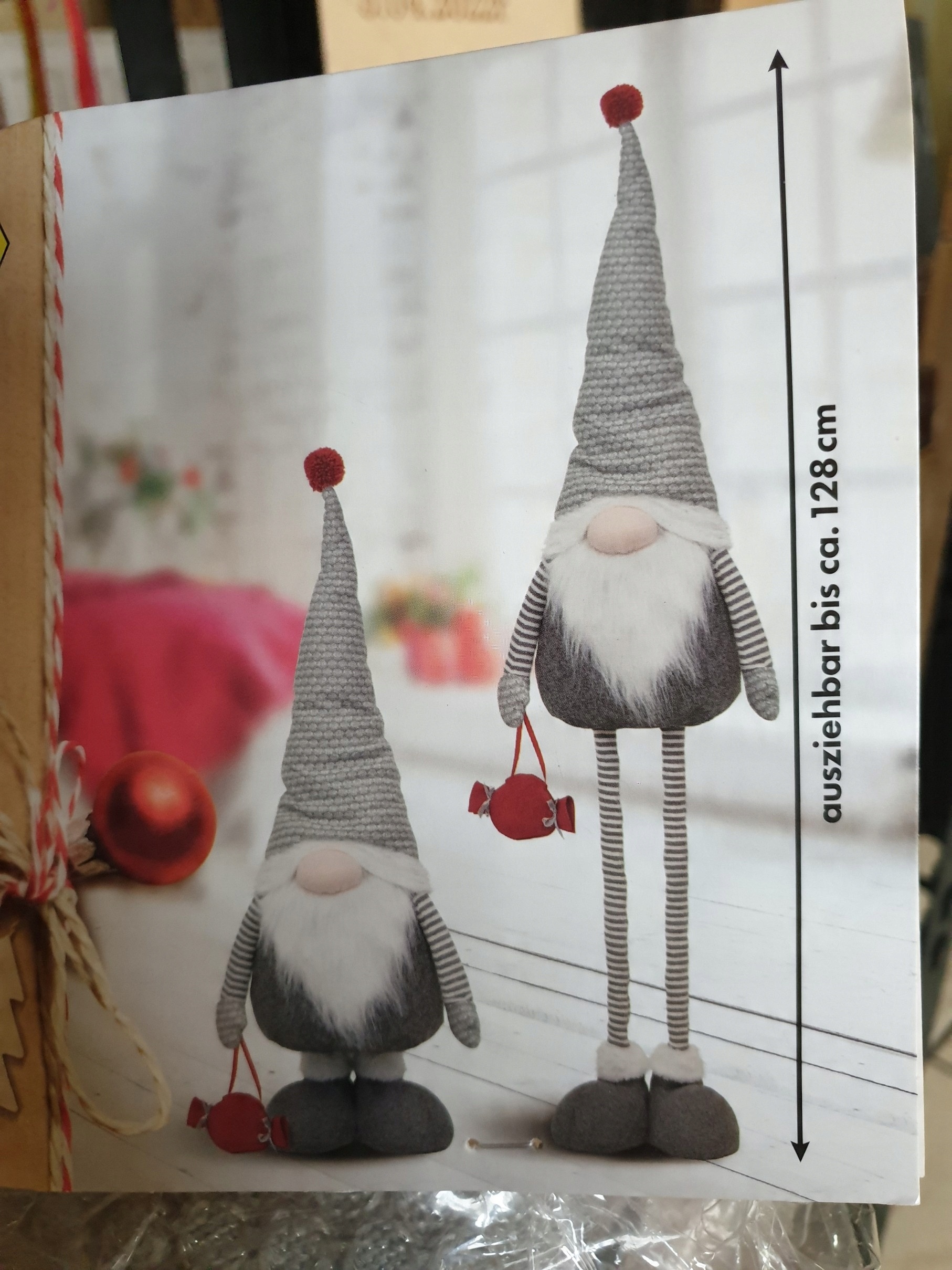 Отличное рождественское украшение, это идеально как рождественское украшение. Гнома имеет заостренную шляпу, большой нос и серая борода. Он был одет в праздничный наряд и меховые туфли. Гнома имеет телескопические ноги. Вы можете установить любую длину от 85 см до 128 см
