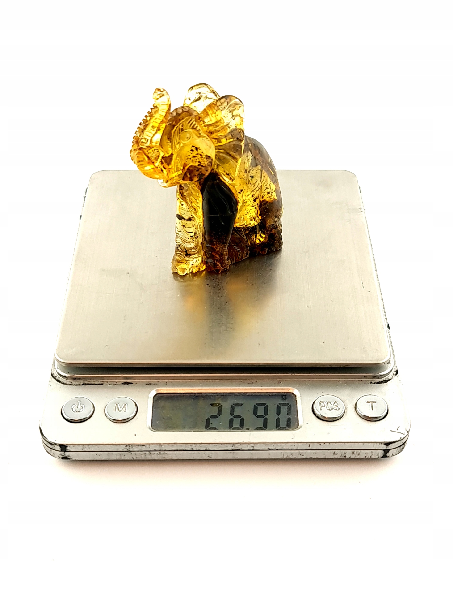 Красивая, замысловатая скульптура слона ручной работы, изготовленная из цельного куска 100% натурального балтийского янтаря. Точная работа с деталями!