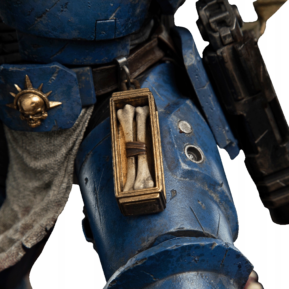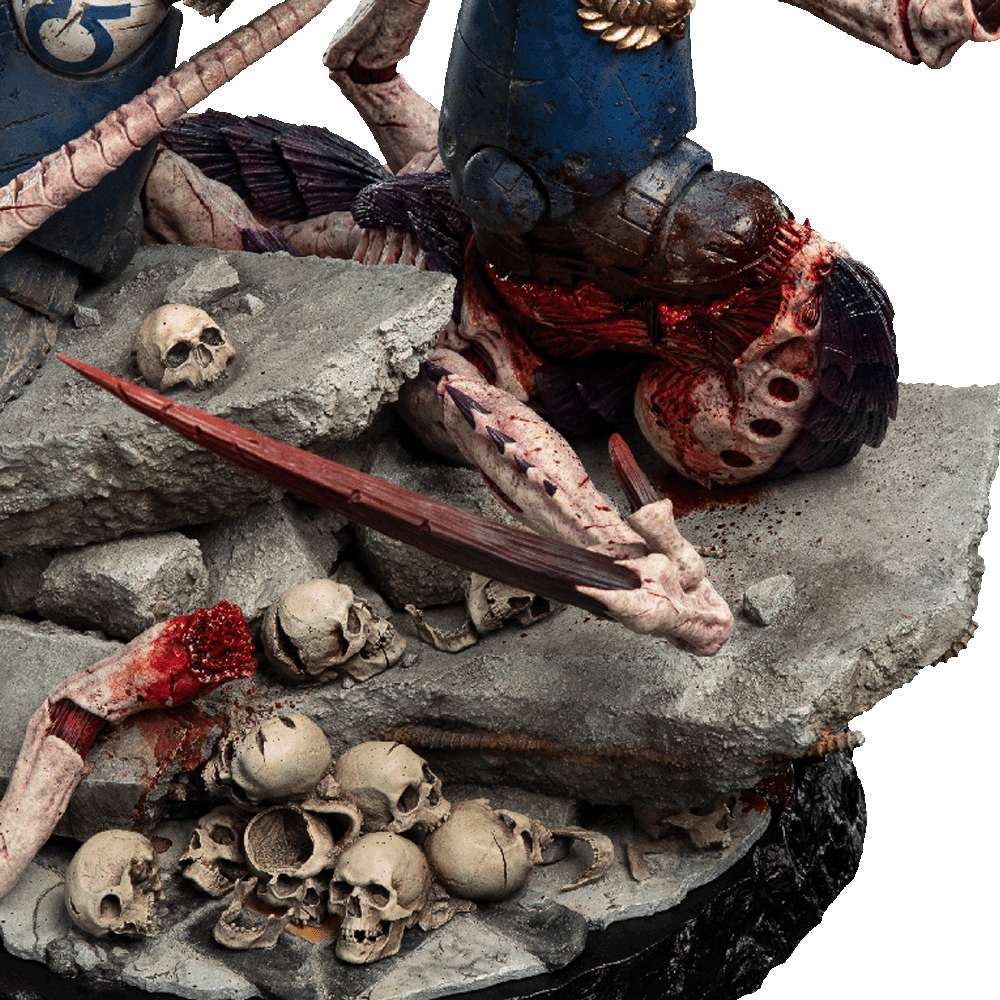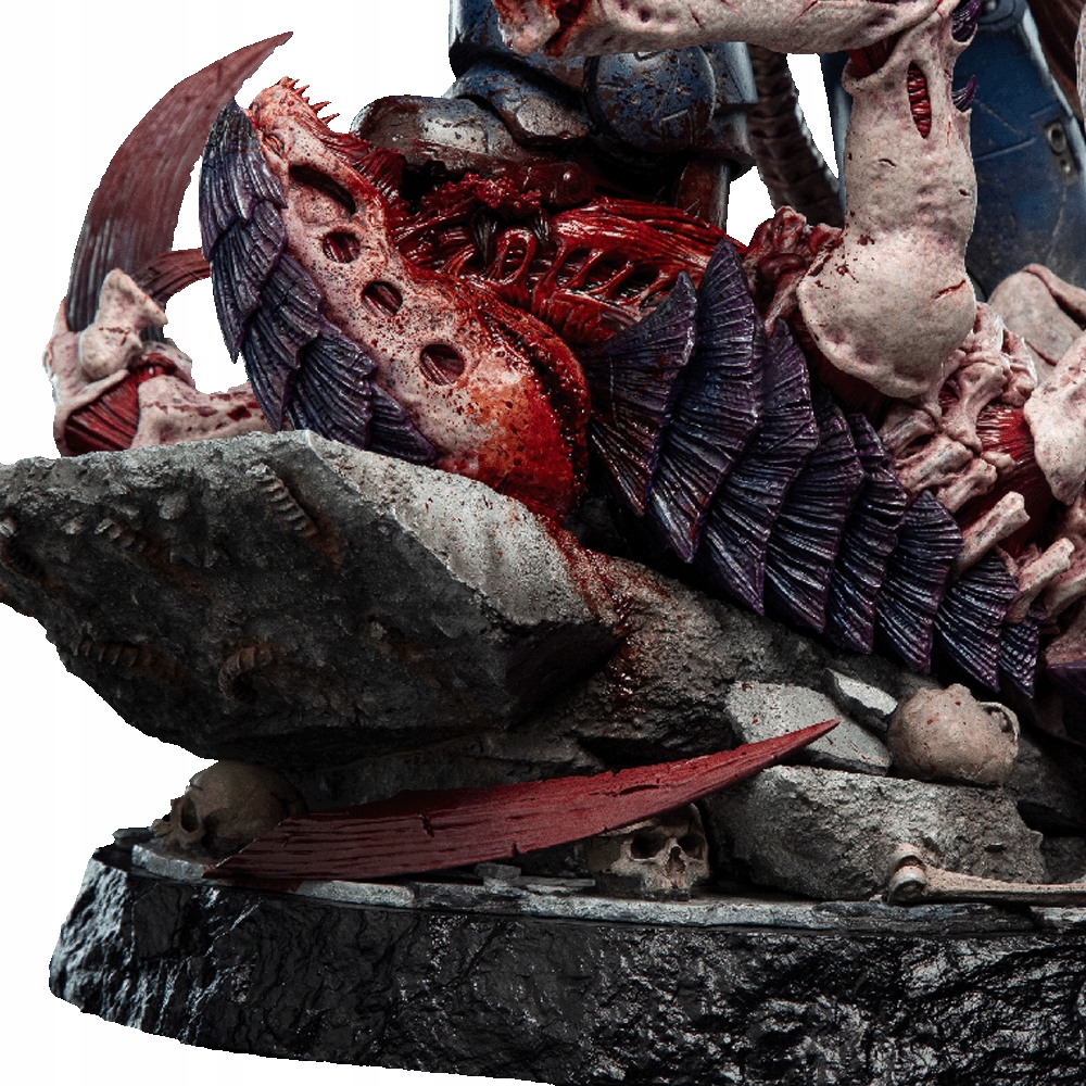 Эта статуя по шкале 1: 6 является доказательством их искусства и отражает каждую деталь, от битвы за шрамом силовой брони, украшенной выразительной геральдией, символизирующей космическую морскую пехоту, до гротескных и сухожильных остатков недавно побежденного Хормагаута.