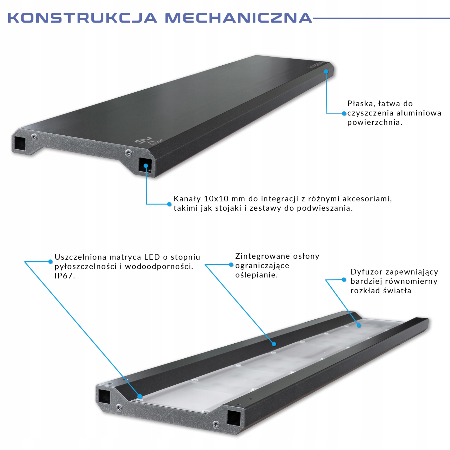 Skylight HYPERBAR также оснащен герметичной светодиодной матрицей с пыле- и водонепроницаемостью IP67, что делает его долговечным и устойчивым к воздействию окружающей среды. Встроенные антибликовые крышки и рассеиватель обеспечивают равномерное распределение света, создавая идеальную атмосферу для растений и рыб в вашем аквариуме.