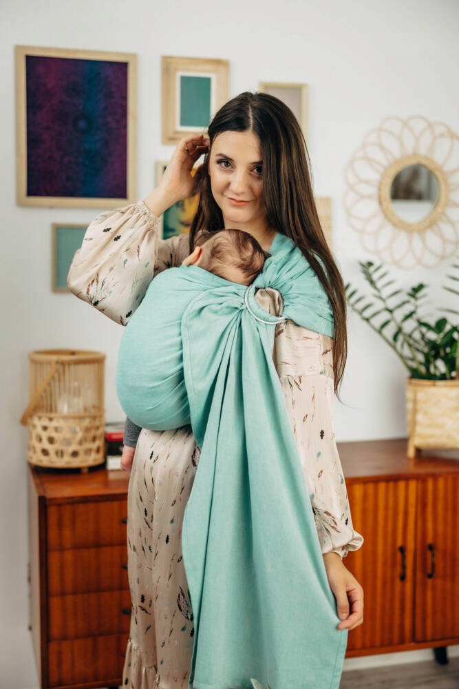 Слинги на кольцах идеально подходят для коротких прогулок, быстрых походов в магазин и т. д. , потому что они асимметрично обременяют пользователя. Их можно носить как на животе, бедре, так и на спине (рекомендовано скорее детям постарше). Слинг с кольцами мы всегда можем иметь с собой, ведь он занимает мало места и его можно предварительно завязать.