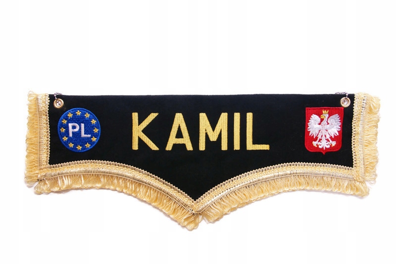 Тема продажи - вышитый кулон с именем kamil . Вы покупаете кулон на черном фоне - надписи и золотые полосы. У нас есть версия с белыми надписями и отделкой, дайте мне знать, что вы предпочитаете при покупке.