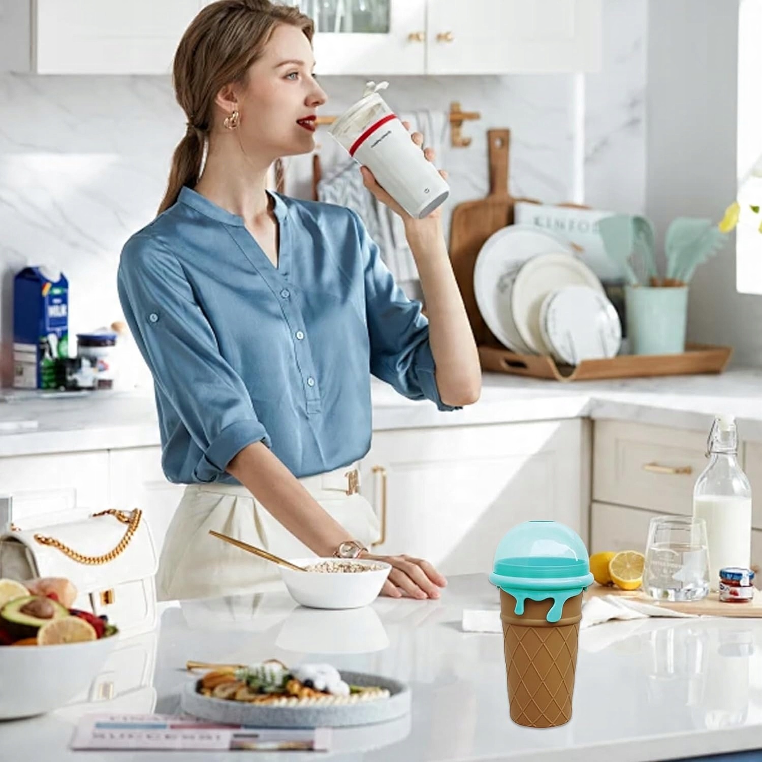 🍧🍧 Шаги использования: 1. Заморозить чашку примерно 3-6 часов, пока чашка мороженого замерзает (чашка станет твердой). Тем временем положите в холодильник избранный напиток, сок или лимонад. 2. Удалите чашки с мороженым из холодильника. Вылейте свой любимый напиток и закройте крышку. 3. Просто нажмите чашки на 1-3 минуты. Тщательно перемешайте время от времени, чтобы получить свой любимый коктейль.