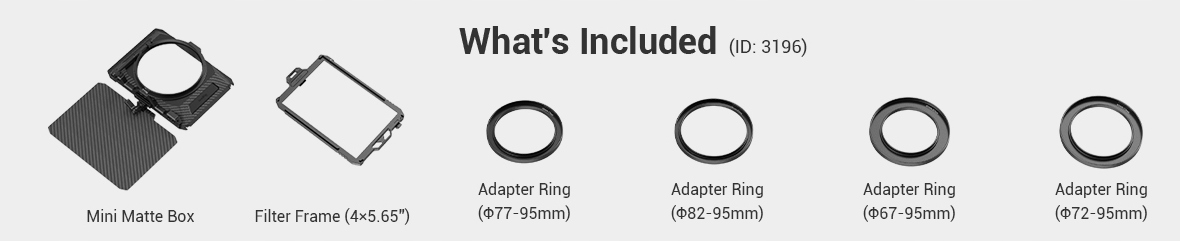 SmallRig 3196 Matte Box Mini предназначен для зеркальных и беззеркальных камер, чтобы предотвратить попадание солнечного света или другого света, вызывающего блики и блики, а также управлять изображениями на экране. Компрессионный разъем работает с переходными кольцами различных размеров (диаметр 52-95 мм; диам. 55-95 мм; диам. 58-95 мм; диам. 62-95 мм; диам. 67-95 мм; диам. 72-95 мм; диам. 77-95 мм; диам. 82-95 мм; диам. 86-95 мм) или прикрепляется напрямую. для объектива Φ95 мм.