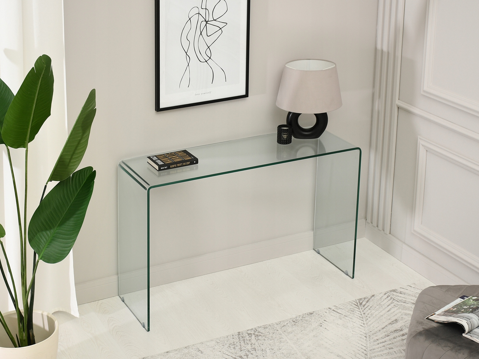 Консоль изготовлена из гнутого стекла, что придает ей необыкновенная прочность и долговечность. Благодаря этому она может служить не только декоративным элементом, но и практичным местом для хранения различных безделушек или декоративных безделушек.
