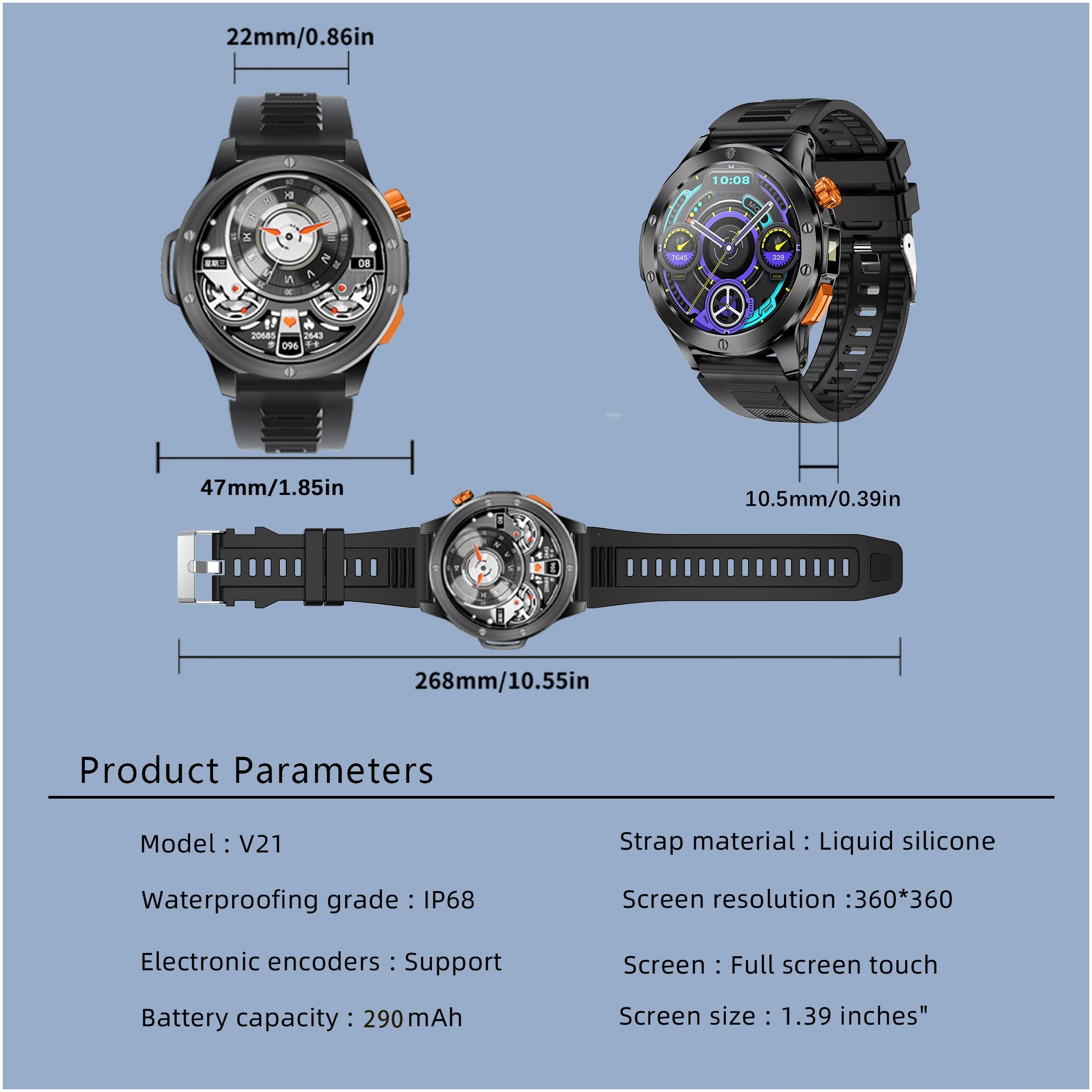 - Стильный внешний вид и комфорт использования элегантный конверт и ремешок из жидкого силикона заставляют V21 выглядеть великолепно на каждой руке, независимо от случая. Большой, 1,39-дюймовый сенсорный экран TFT HD обеспечивает превосходную читаемость и интуитивную работу.