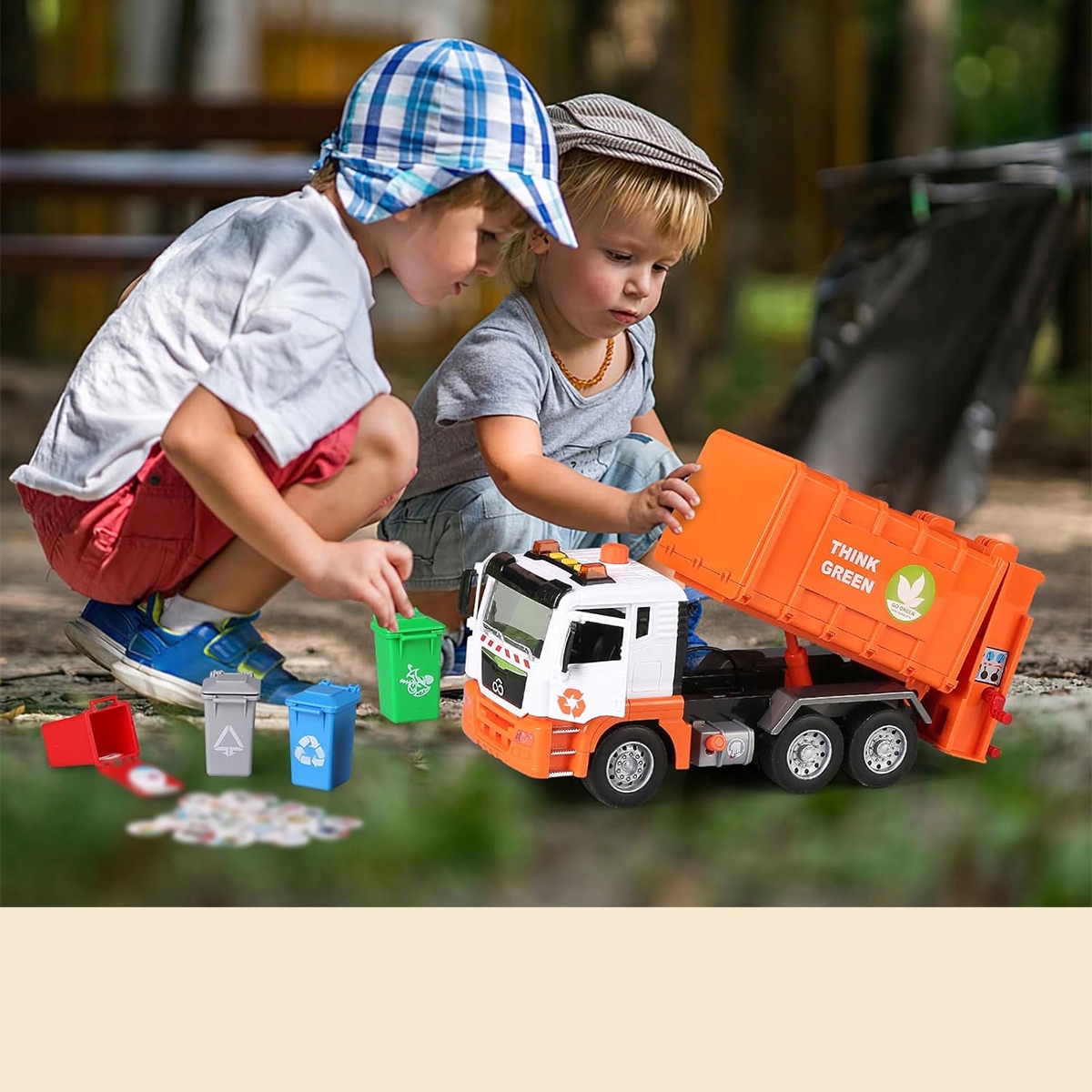 В заднем отсеке размещаются мусорные баки, а рычаг имитирует сбор мусора для реалистичного развлечения.
