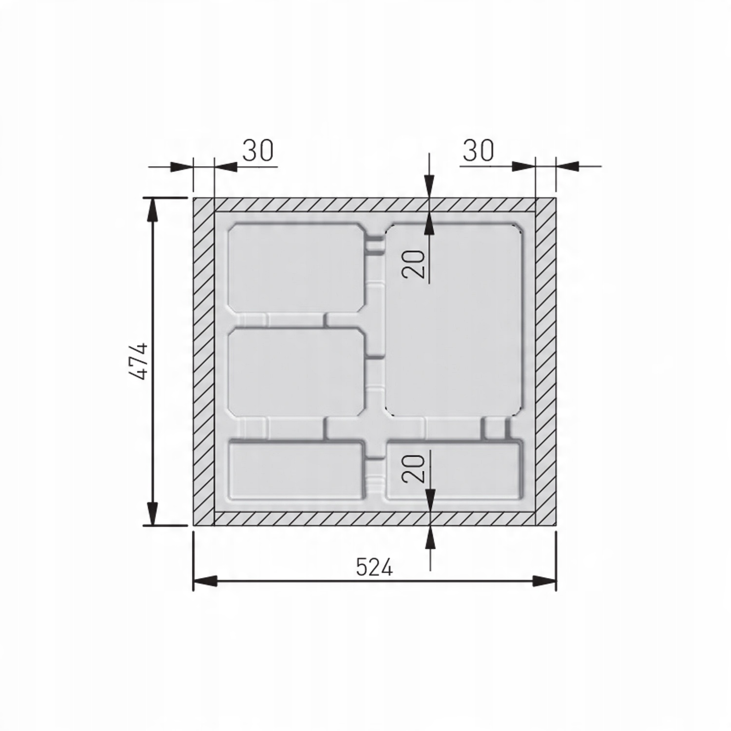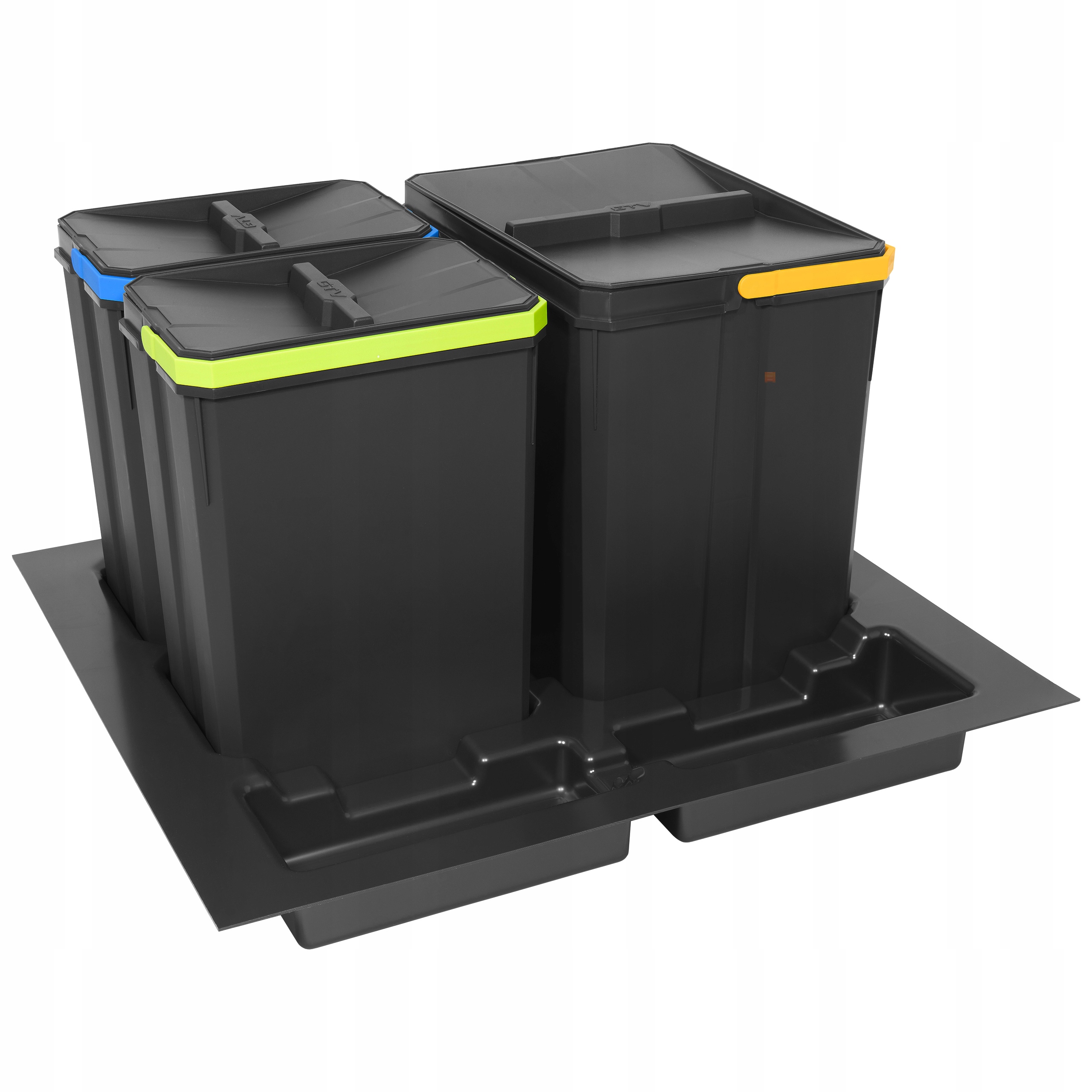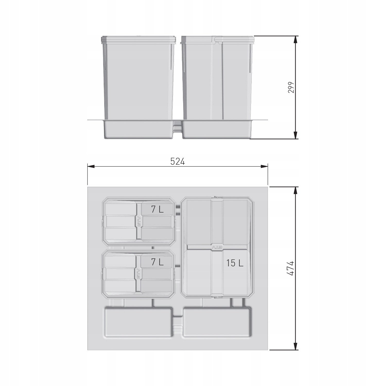 Тройной корзину для мусора, предназначена для ящиков с фронтом 60 см. Продукт включает в себя картридж, который можно разрезать, один контейнер с емкостью 15 л и два контейнера с емкостью 7L. На подносе есть место, где вы можете легко хранить, например, мешки с мусором или экономическая химия.