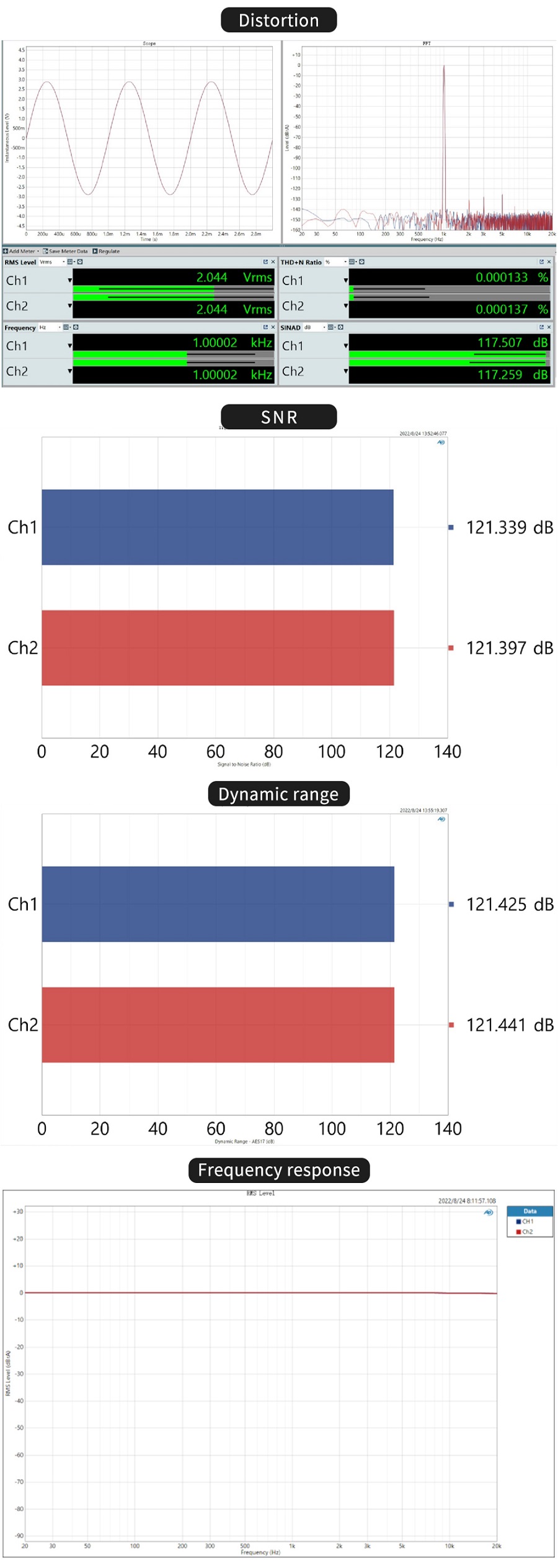 Используя новый, тщательно настроенный AKM AK4493S, устройство может достичь беспрецедентного значения THD+N 0,00013%.
