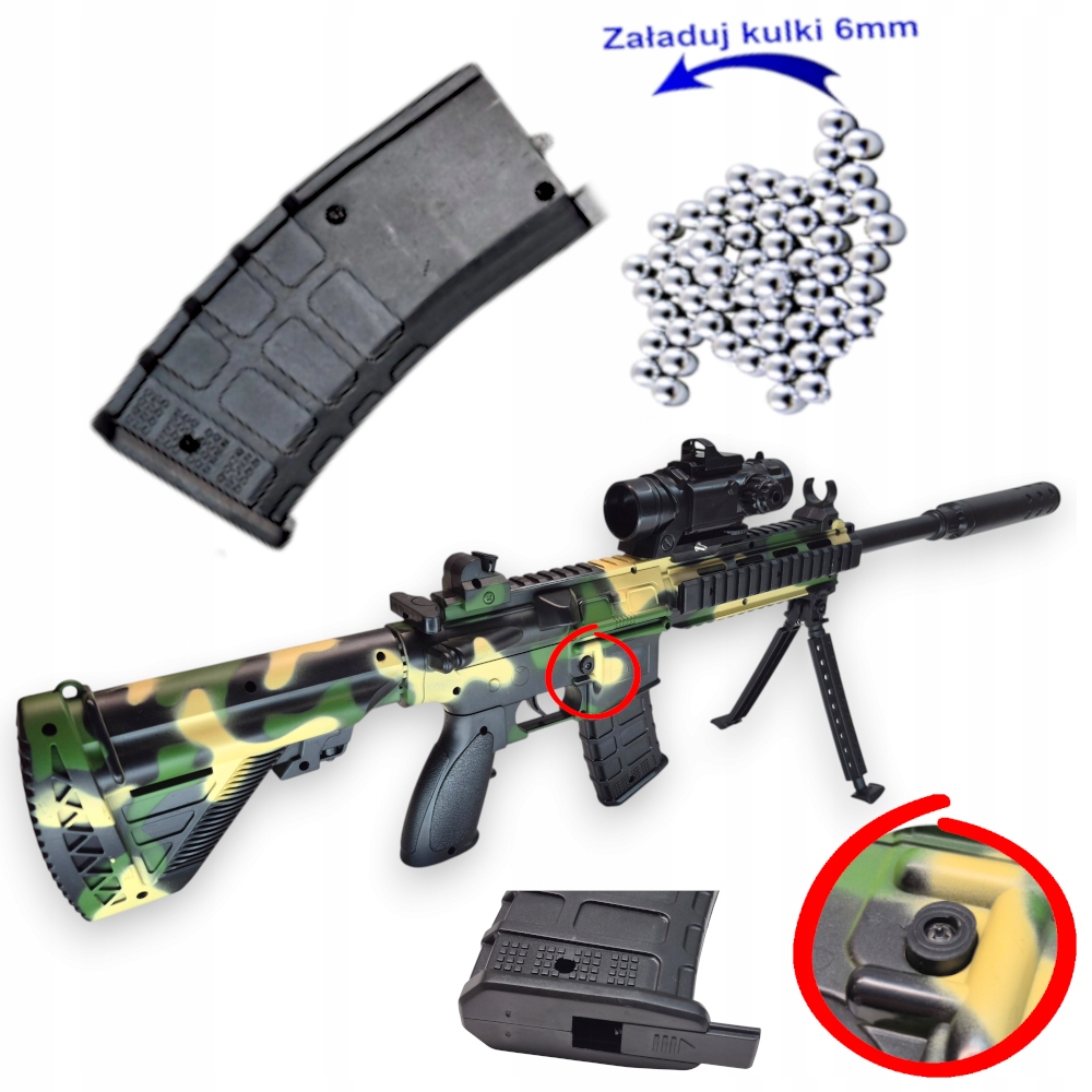 Чтобы гарантировать, что неправомерная работа винтовки рекомендуется использовать плавные шарики весом 0,12 г или заряженных шариков, тщательно протестированных при отсутствии пластикового фона впрыска.