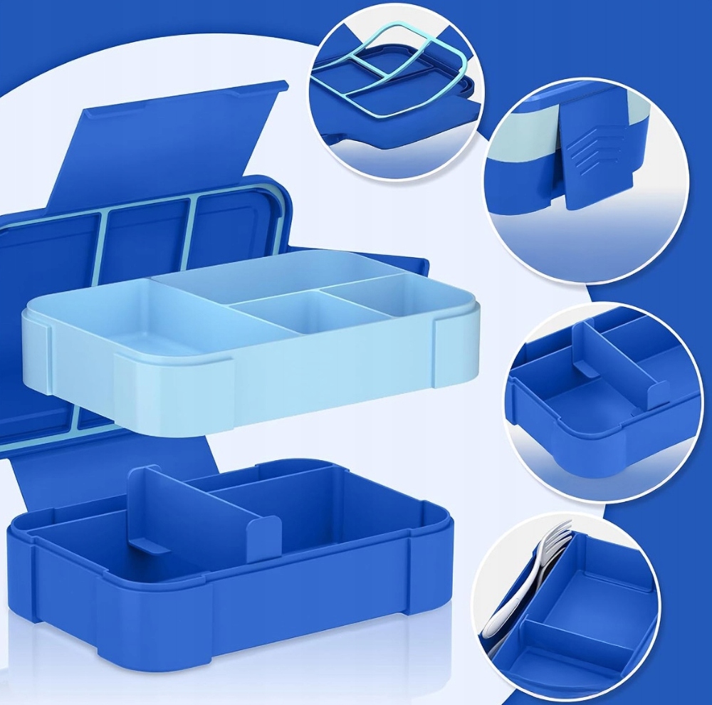 На четырех страницах есть невидимые, скрытые зажимы, которые близки к коробке Бенто, сильны и не падают легко. Крышка имеет встроенное силиконовое герметичное кольцо, которое плотно и не протекает от него после встряхивания. Дно верхнего контейнера обернута в слое силиконового кольца, что предотвращает выходить из средней камеры.