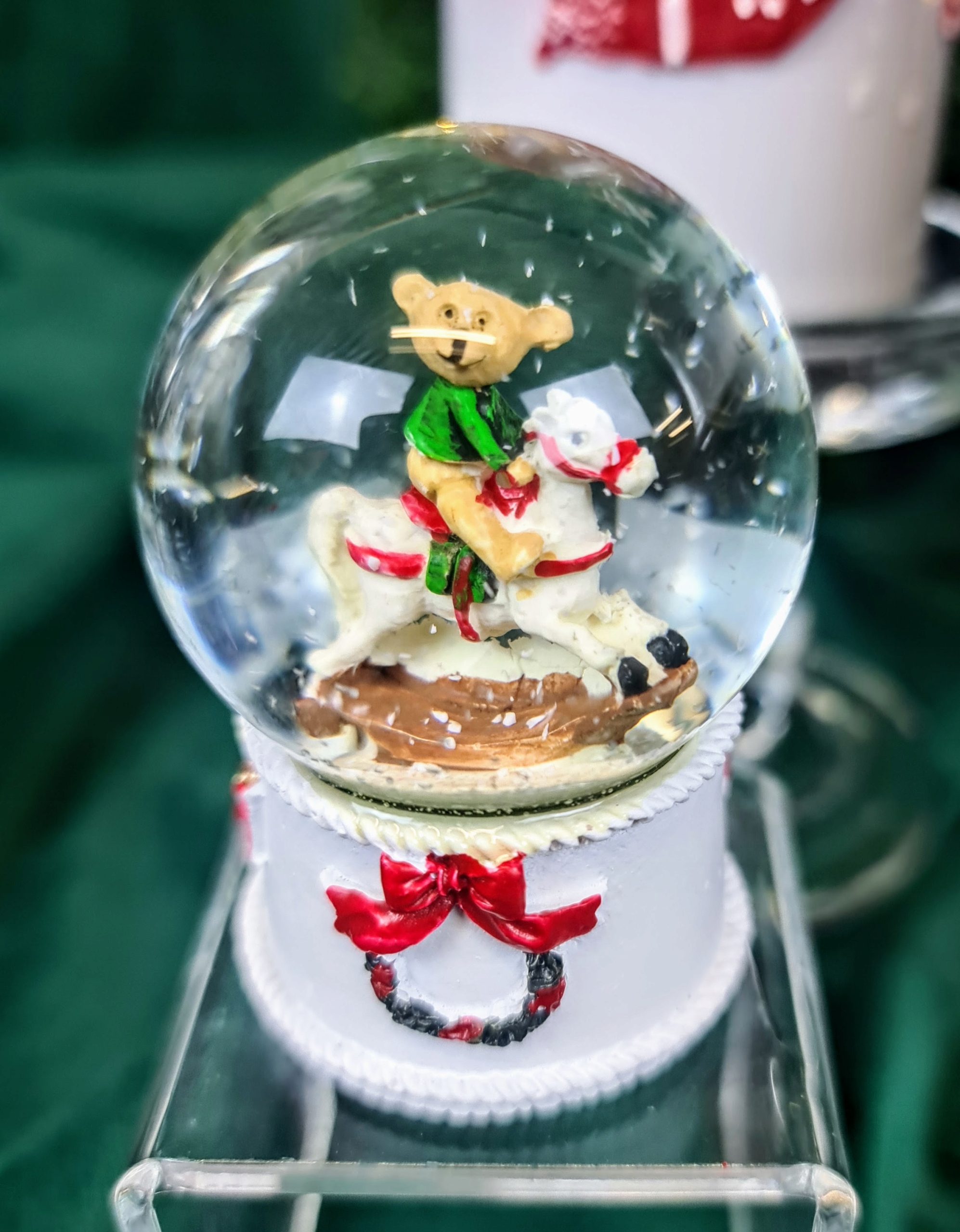 Красивый новогодний водный шар со снегом. В центре фигурка мишки на лошадке. Создайте замечательную новогоднюю коллекцию у себя в квартире, сделайте необычный подарок друзьям, приобретя украшение вместе с другими товарами, имеющимися в каталоге АЛМАДЕКОР.