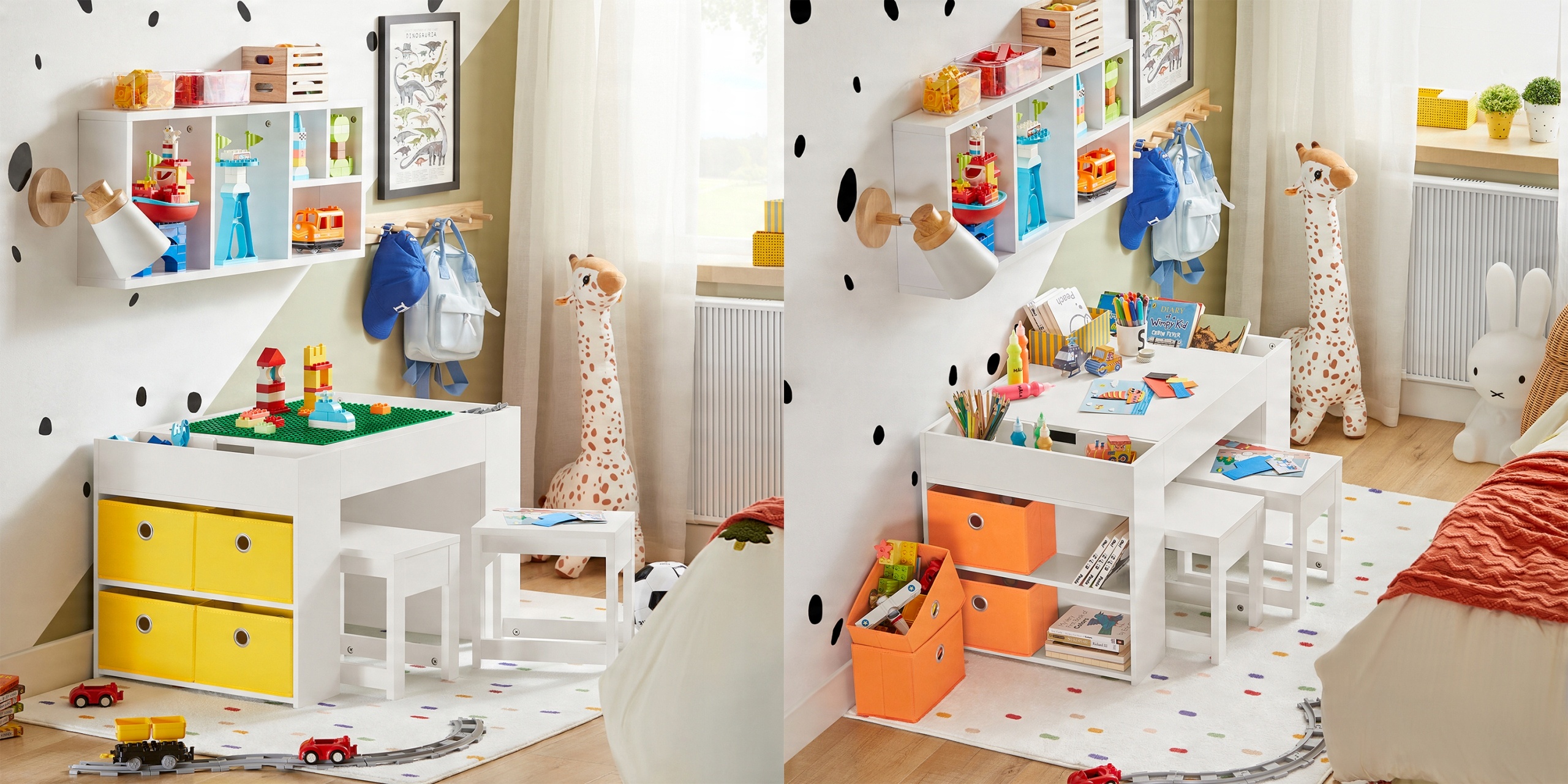 Помимо 8 отделений (24x14x16 см) и двух отсеков-отверстий, имеется еще место для хранения вещей под столешницей. Таким образом, дети могут легко хранить LEGO или другие игрушки после игры в своей комнате.