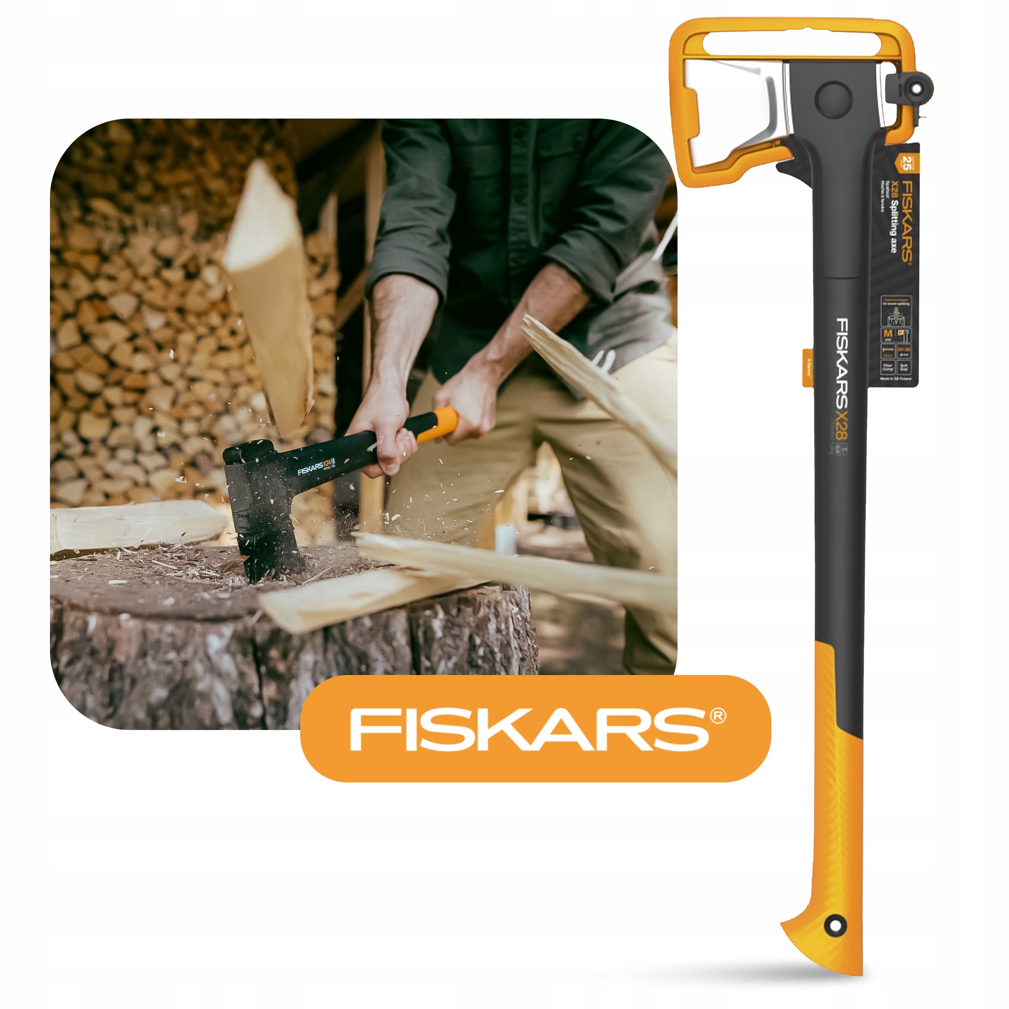 Топор Fiskars X28 с лезвием М идеально подходит для колки стволов среднего размера диаметром 20 см - 30 см.