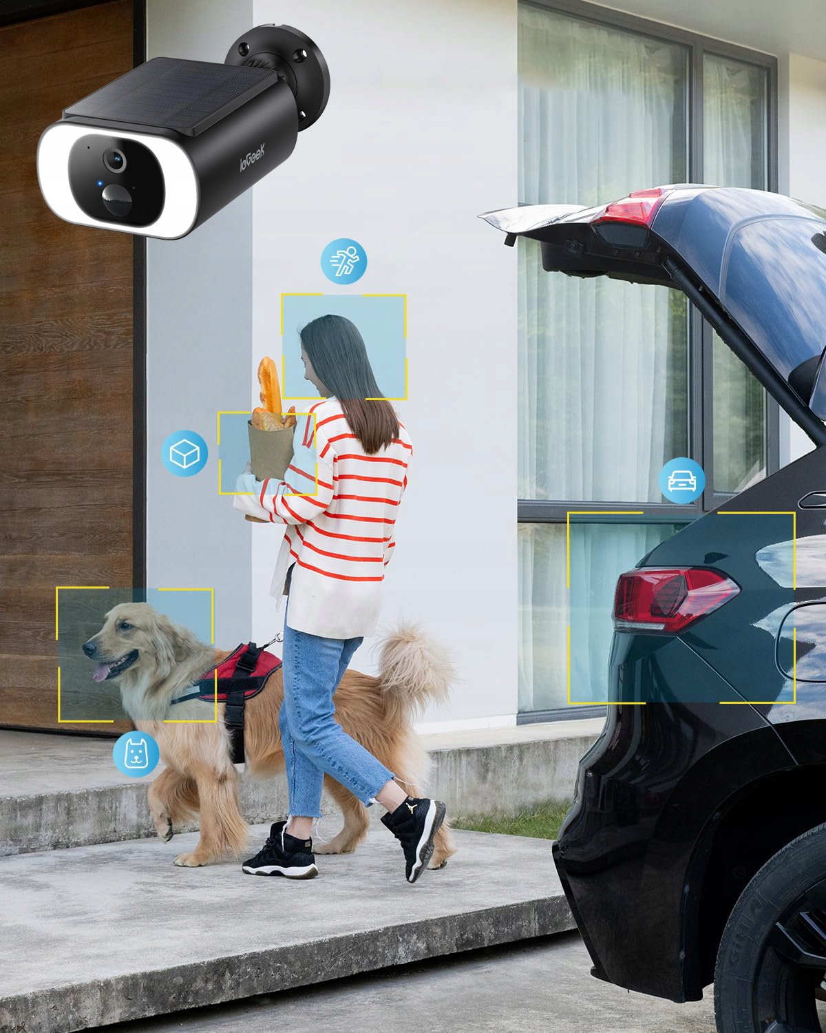 После обнаружения трафика вы получите немедленные уведомления в IEGEEK CAM, а затем вы можете услышать и поговорить с посетителями или активировать сирену и яркие фары, чтобы отпугнуть злоумышленников.
